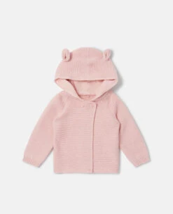 This rose pink hooded cardigan from Stella McCartney Kids is consciously crafted from organic cotton and wool in a charming seed knit. Little animal ears at the hood add a adorable Stella twist.