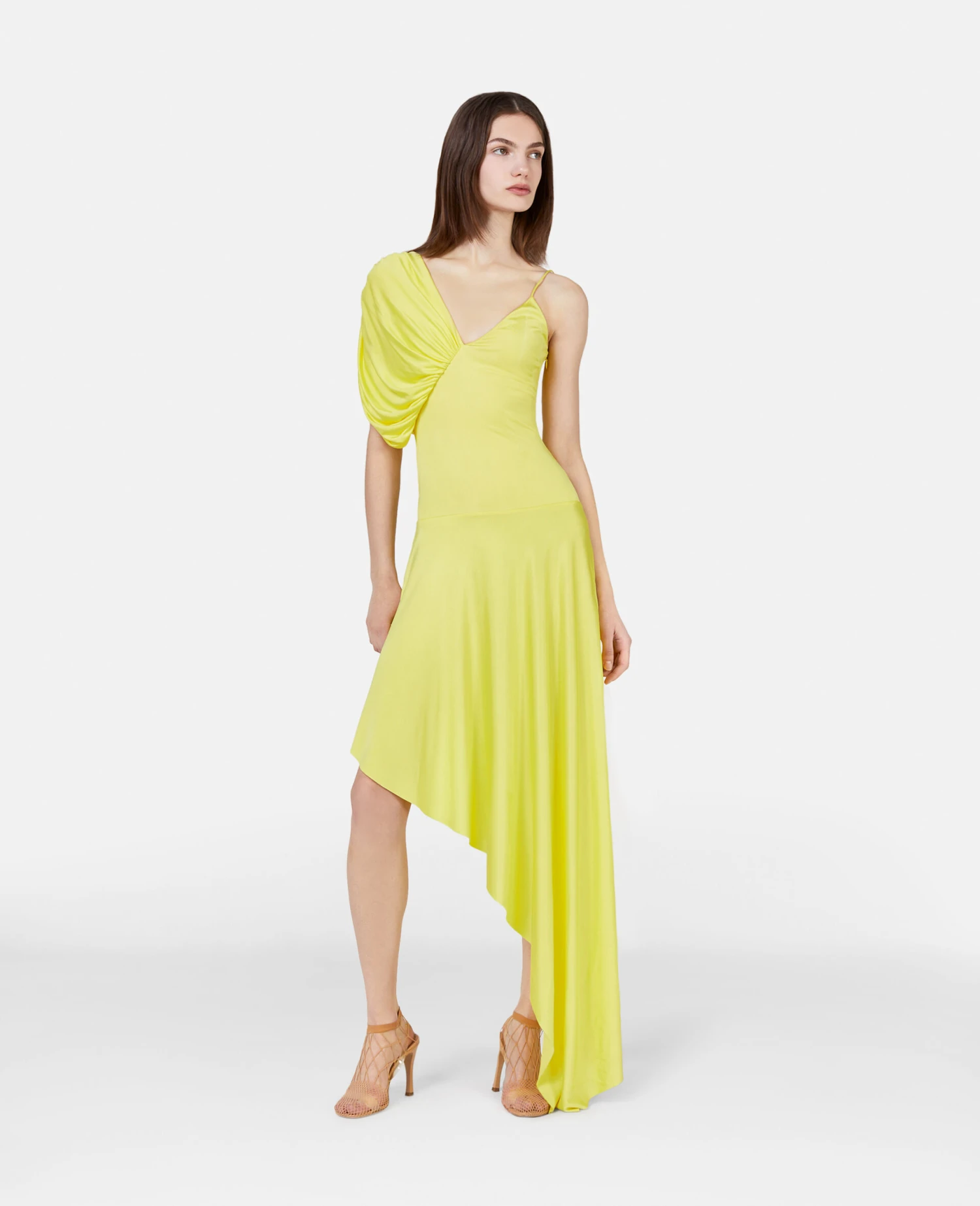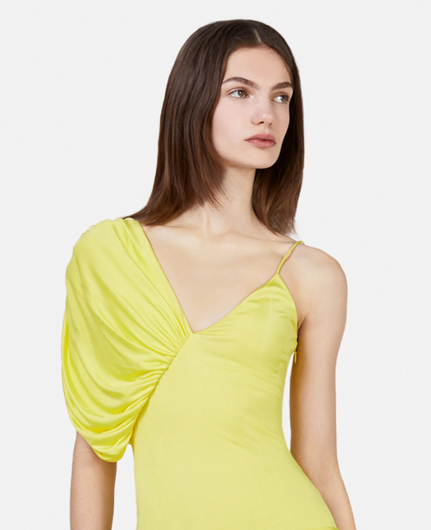 In sherbet lemon yellow, this mini dress from Stella McCartney is a fluid, asymmetric design. The mini dress is consciously crafted from FSC-certified forest-friendly viscose fluid jersey with variegated sleeves and a flowing cape hem that extends from one side – a playful Stella twist for Summer 223.