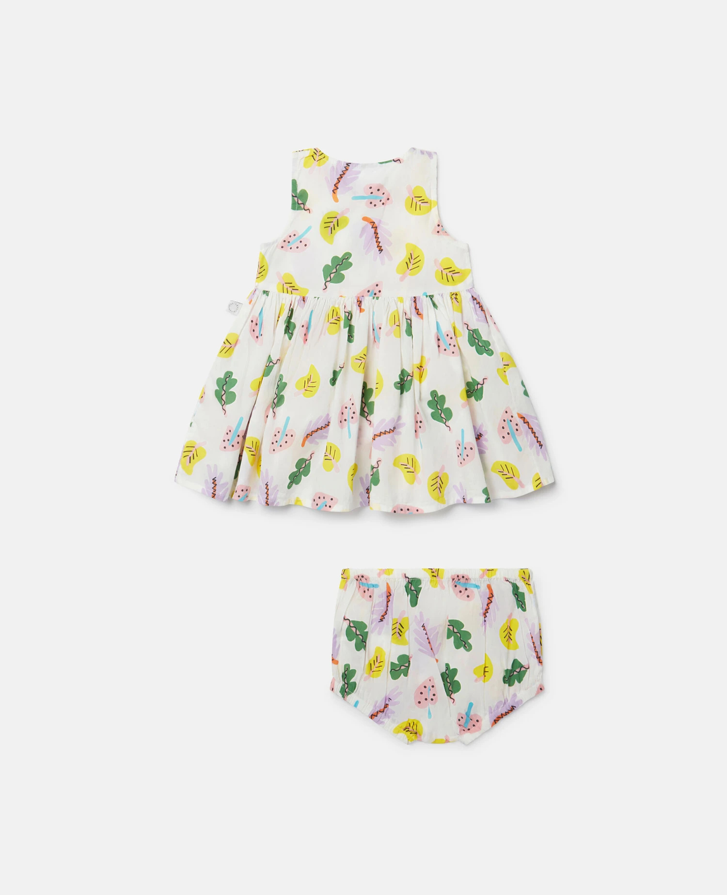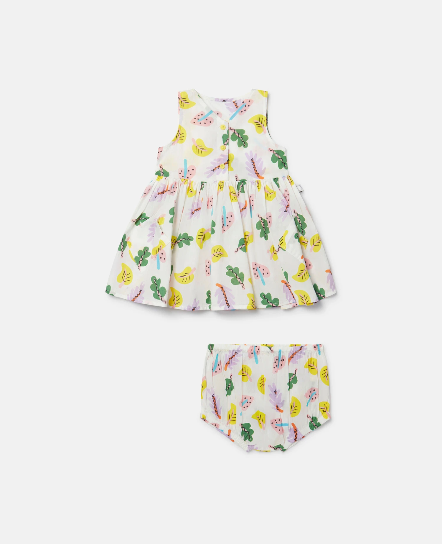 For Spring Summer 223, Stella McCartney Kids returns to our playful roots – celebrating brand codes of self-love, creativity and the pursuit of one’s dreams. This baby dress and bloomers set is covered in a charming baby palm leaf print and is consciously crafted from organic cotton voile, safely grown without harmful chemicals or pesticides.