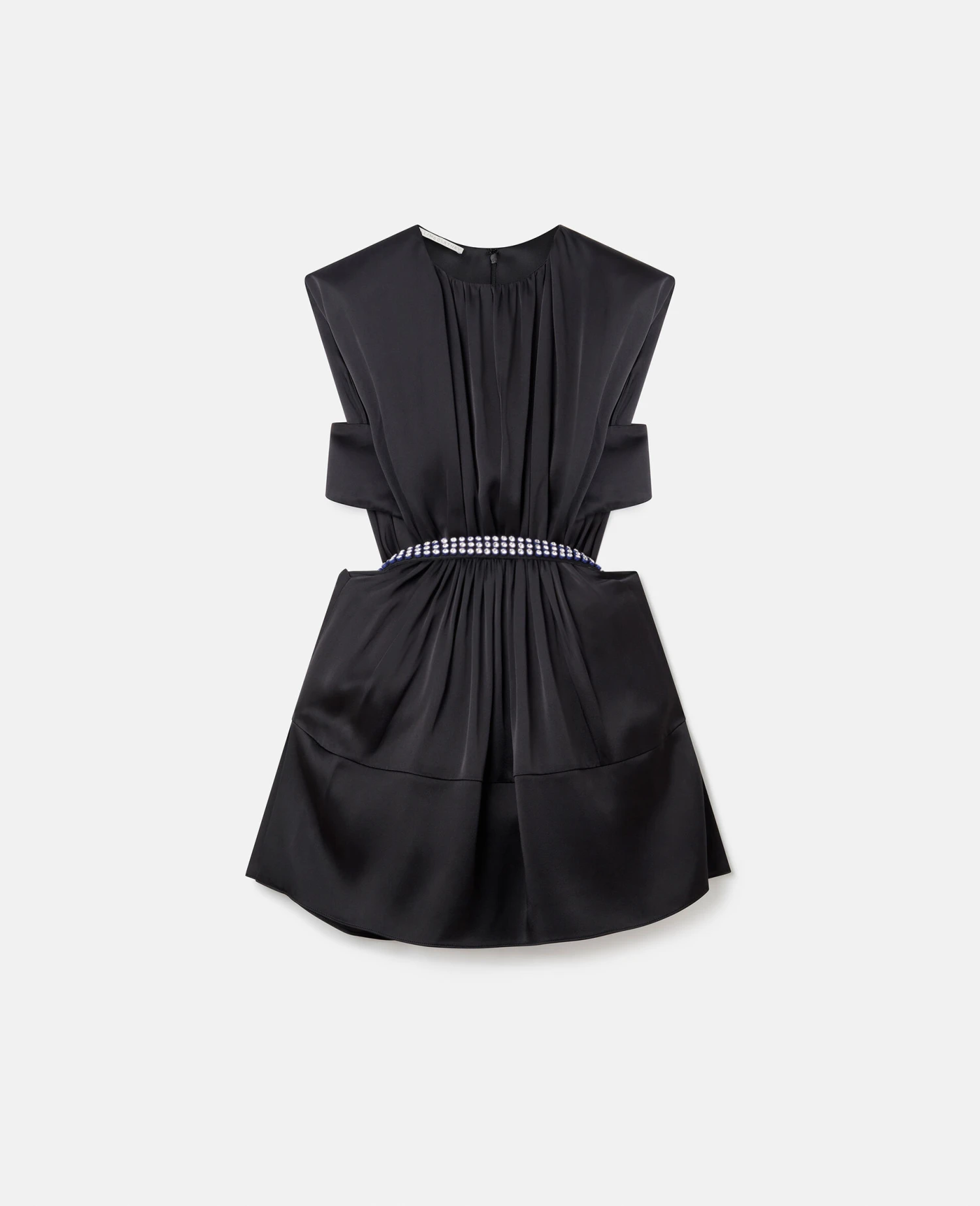 Inspired by native flora and fauna, this midnight black mini dress from Stella McCartney transitions down to the mid-thigh in soft pleats. Its pleated front leads to cut-outs at the waist, gracefully held together by diamanté belting.