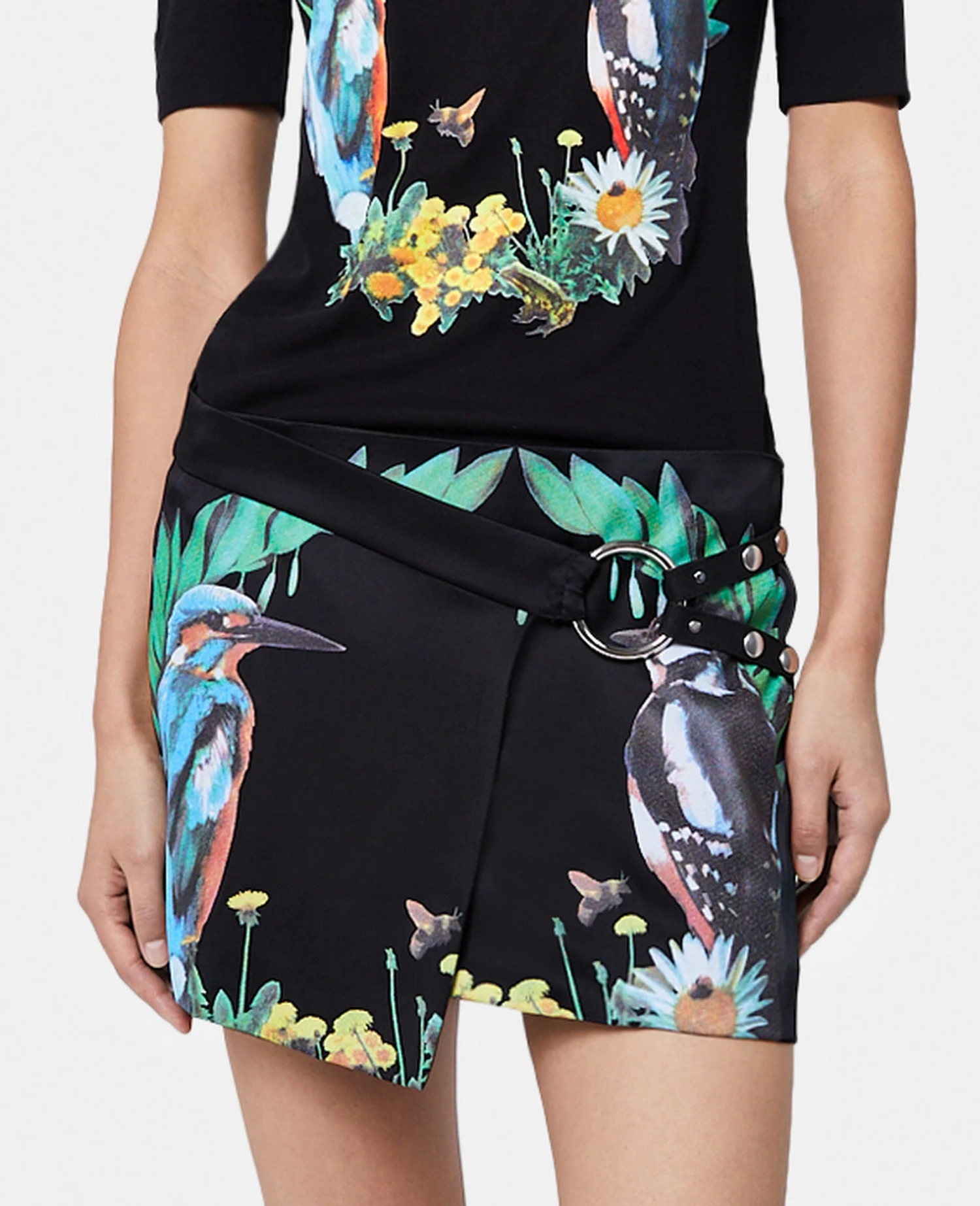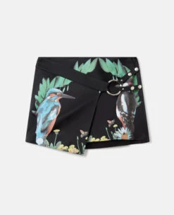 Elevate the everyday with this wrap mini skirt from Stella McCartney. The mini skirt is made from satin, with an all-over print of native British birds and a black circular side belt for utilitarian appeal.