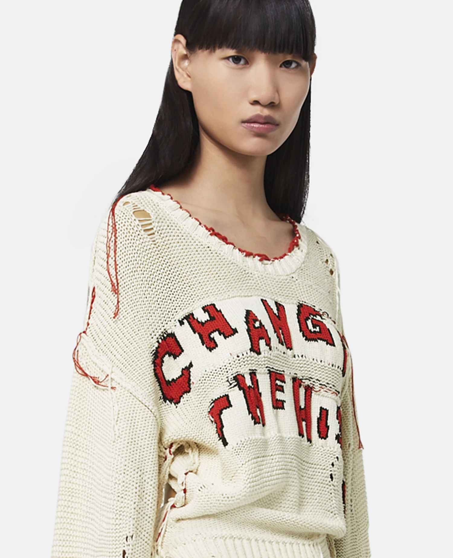 - Red ‘CHANGE THE HISTORY’ intarsia knit on front