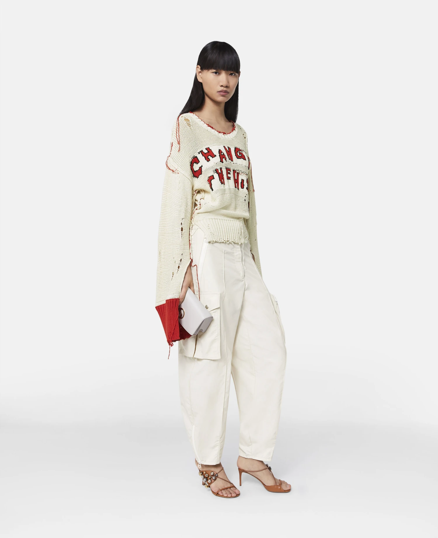 Mindfully designed with a slight crinkle texture and extra-long sleeves, this Yoshitomo Nara × Stella McCartney jumper features a bold ‘CHANGE THE HISTORY’ slogan – an alignment of our shared vision and values with the legendary Japanese artist.