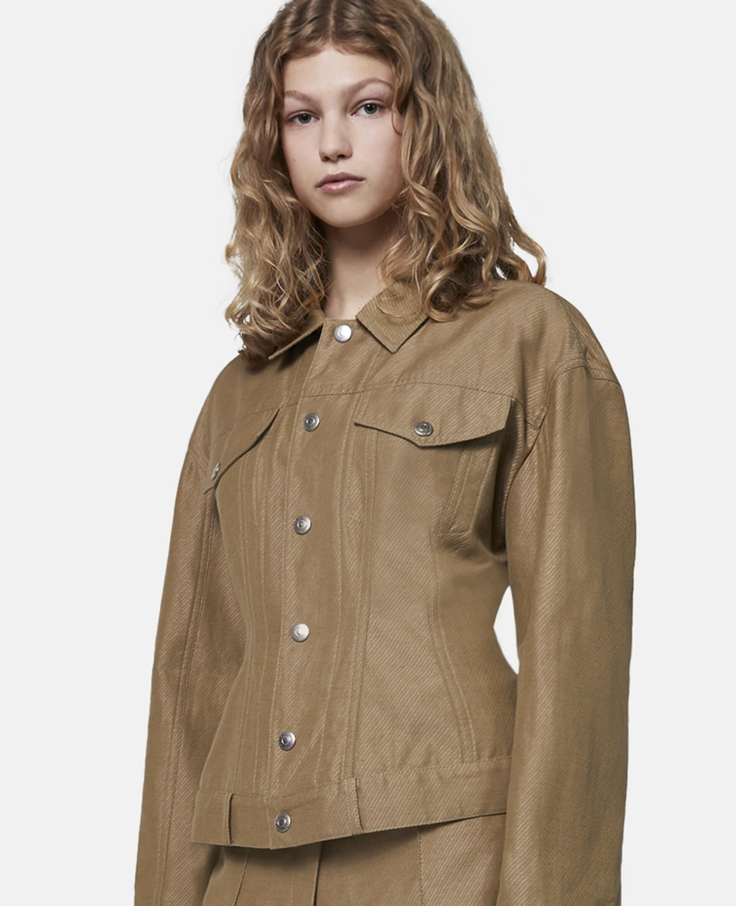 The soft corsetting that is emblematic of this season reigns on this caramel tan utility jacket. The jacket is consciously crafted from GOTS-certified cotton tailoring fabric, with chest pockets and a utilitarian belt loop hem.