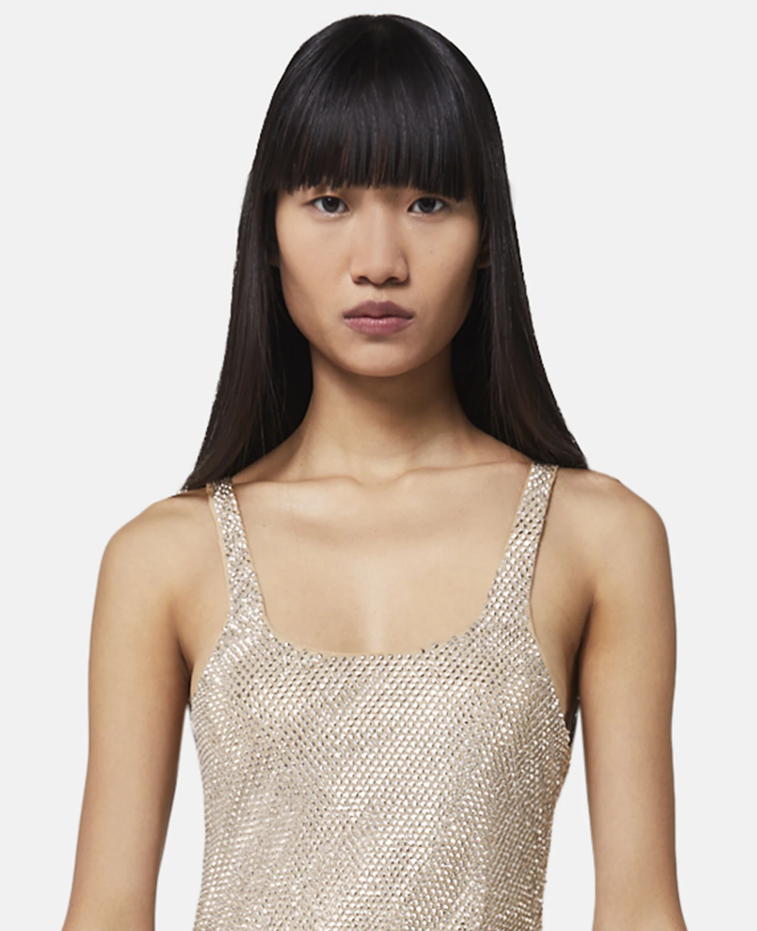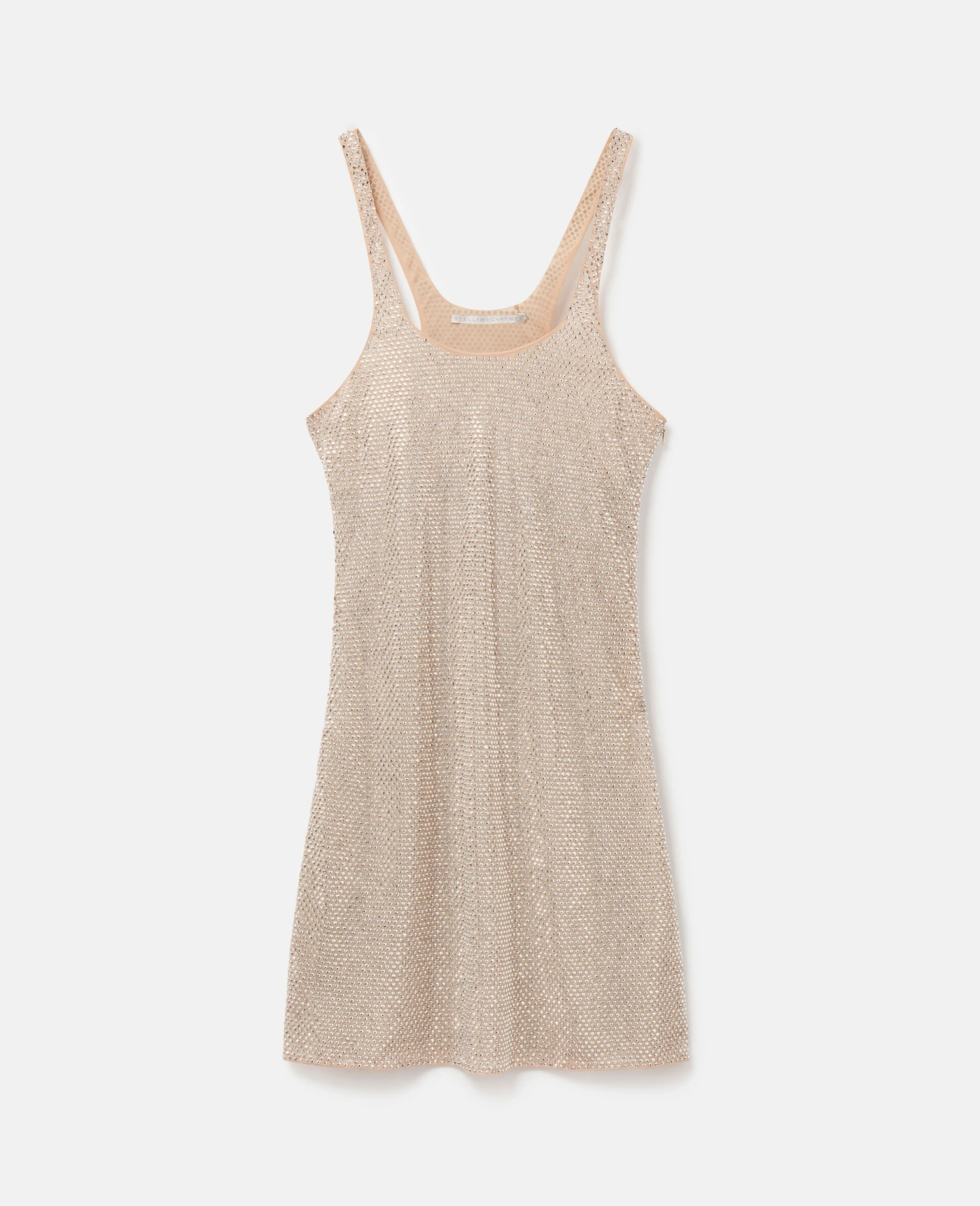 Summer 223 is an affirmation of the Stella DNA – minimal, sensual and always with a playful wink. This seductive silver mini dress from Stella McCartney is crafted from diaphonous pure silk georgette with an all-over glass crystal strass and an unexpected racerback design.