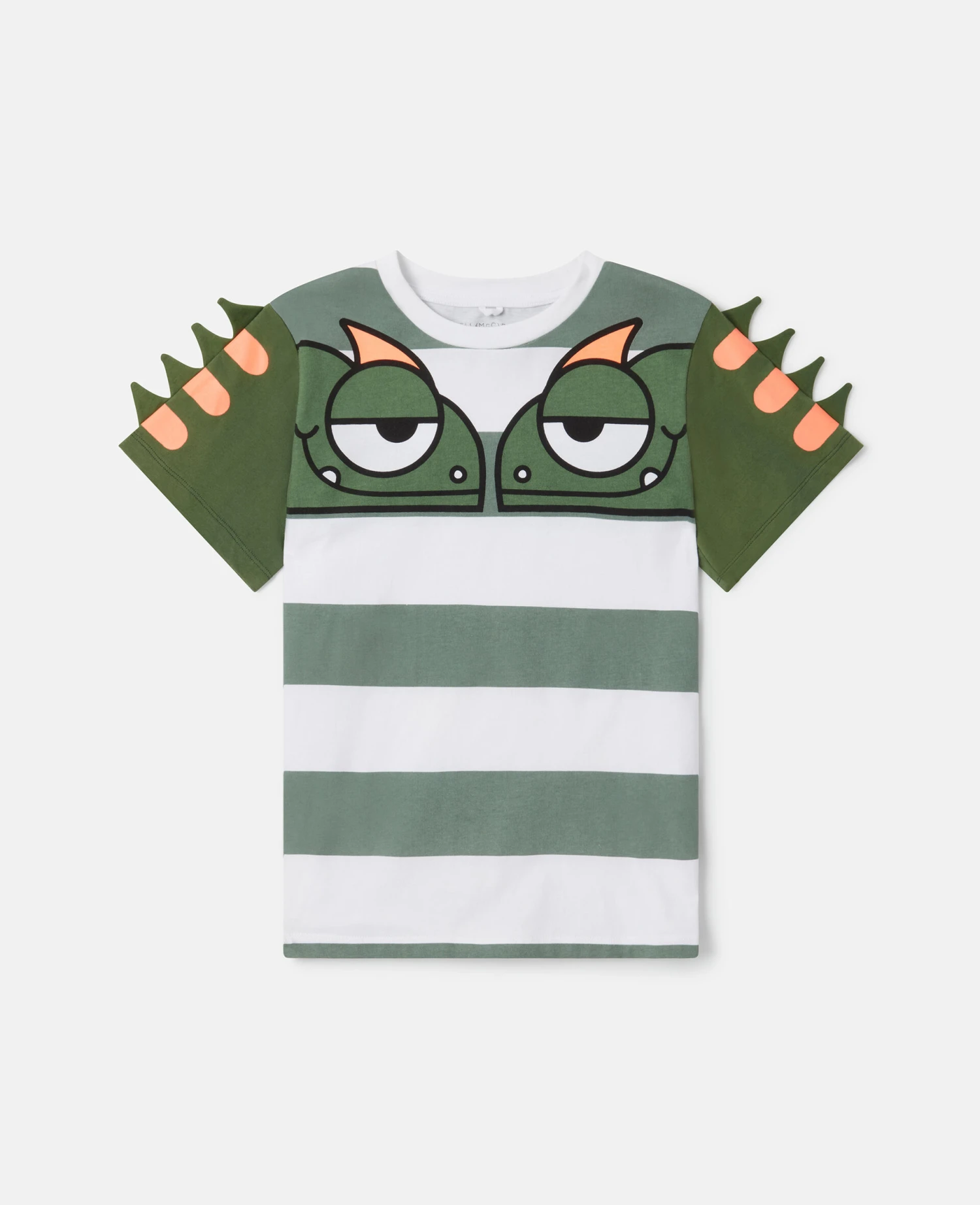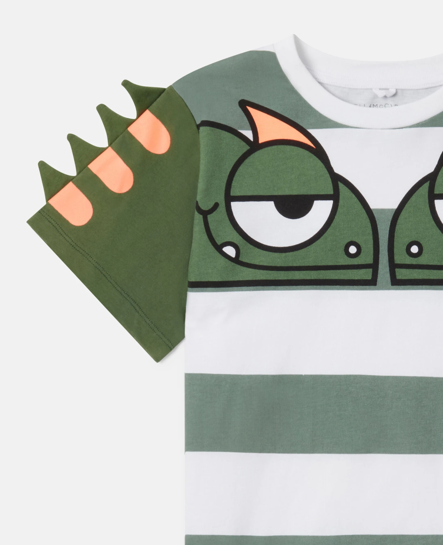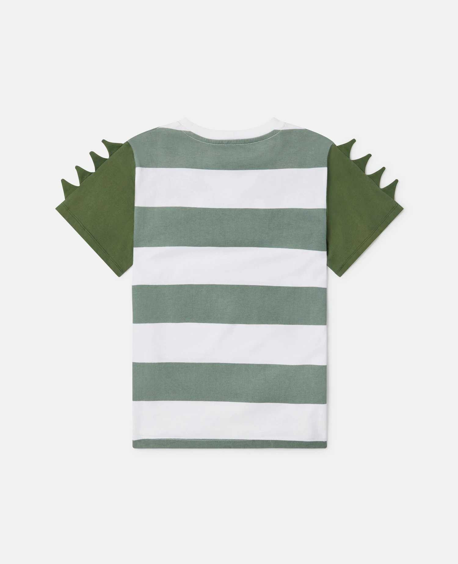 This season, Stella kids celebrate all of Mother Earth’s creatures. This striped t-shirt from Stella McCartney Kids is elevated with a double gecko print at the front and fun spike details.