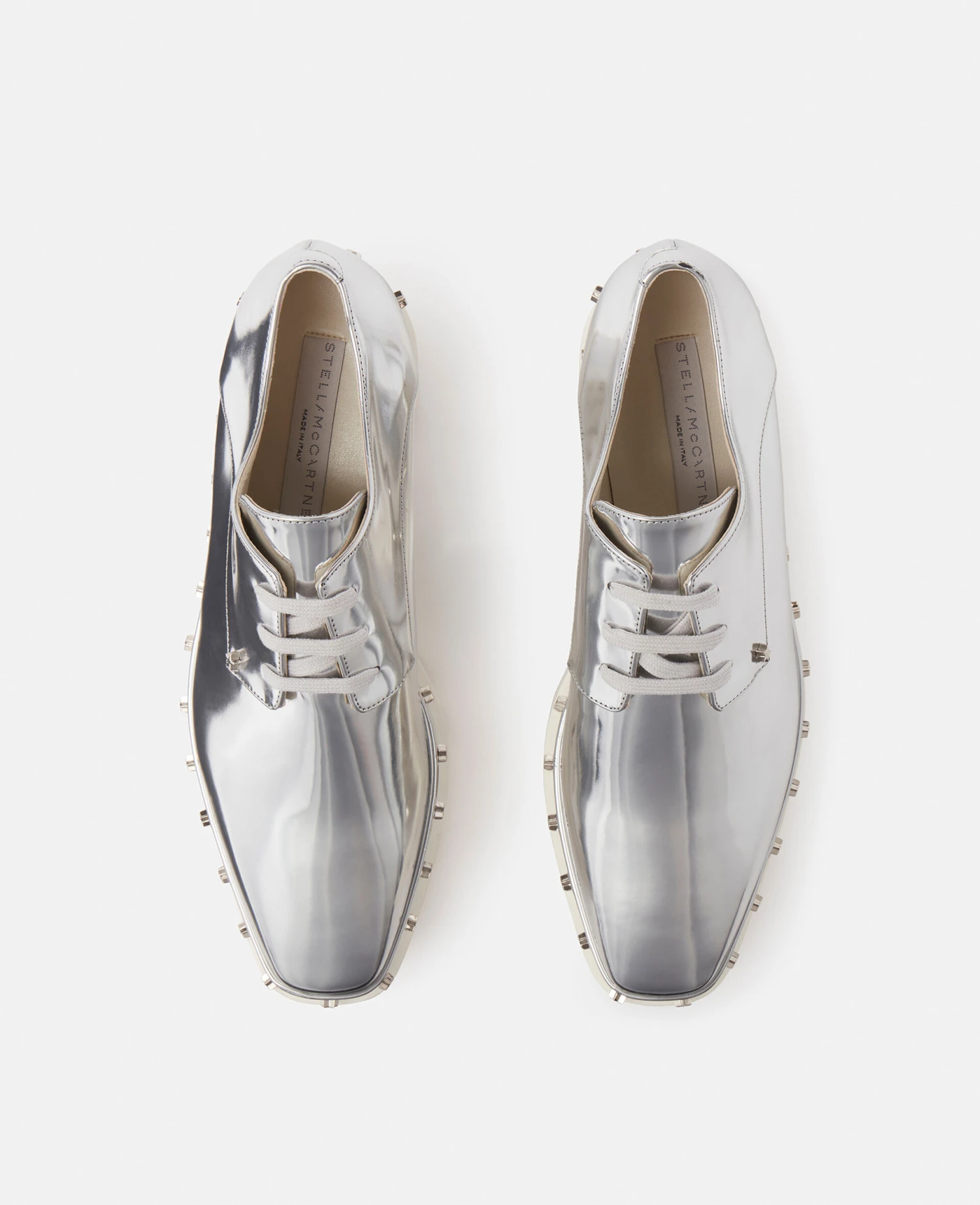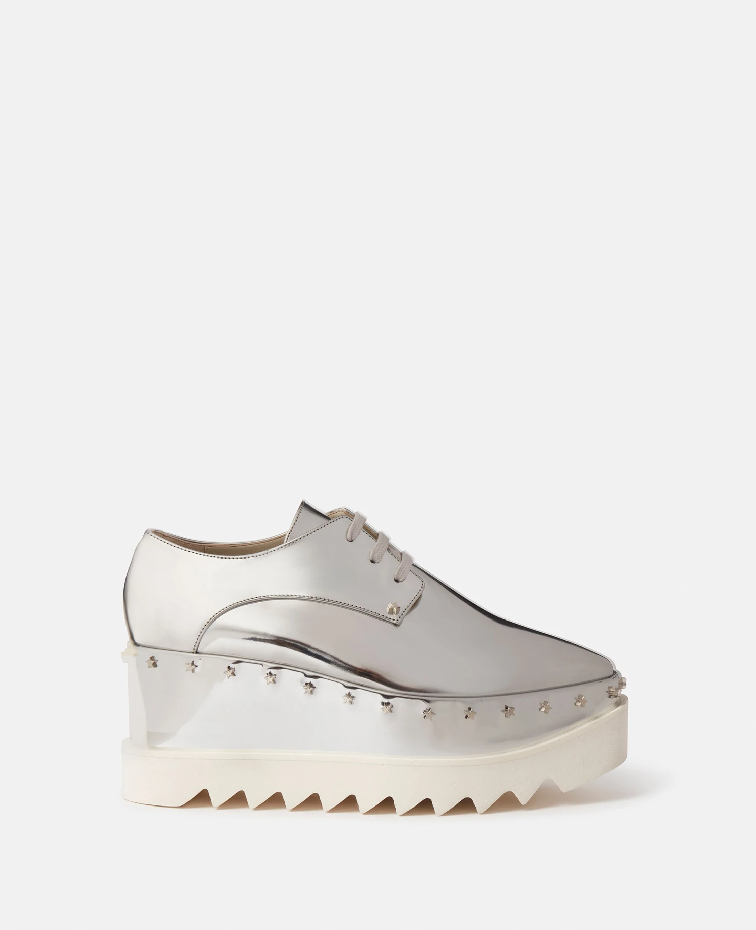 Dotted with star studs at the midsole, these Elyse platform shoes are a new Stella icon. The iconic platforms are consciously crafted from laminated mirrored Alter Mat vegan alternative to animal leather with an angular square toe, platform wedge heel and signature saw-edge micro sole.