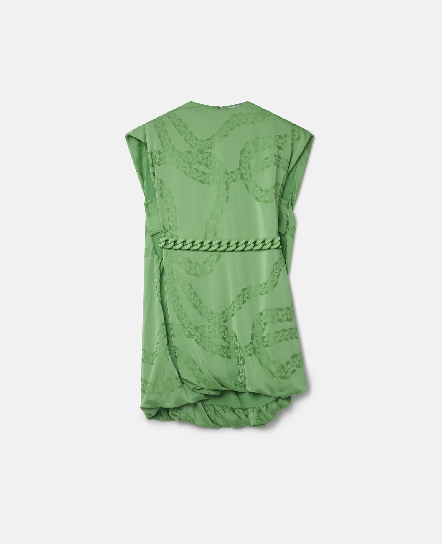 This bright green mini dress revisits our iconic Falabella chain, screened as a subtle jacquard on forest-friendly viscose double satin. The mini dress has cap sleeves with deep armholes for a fluid yet sculptural silhouette, while tonal Falabella chain belt cinches the waist just-so.