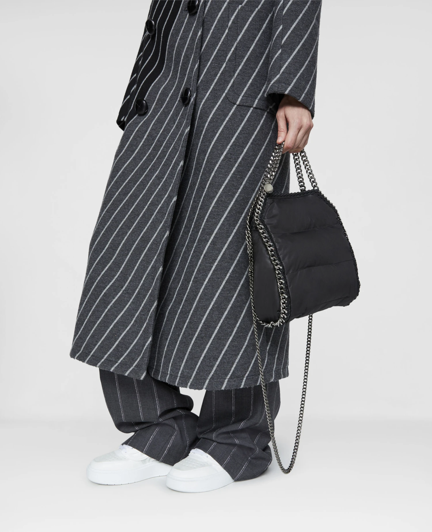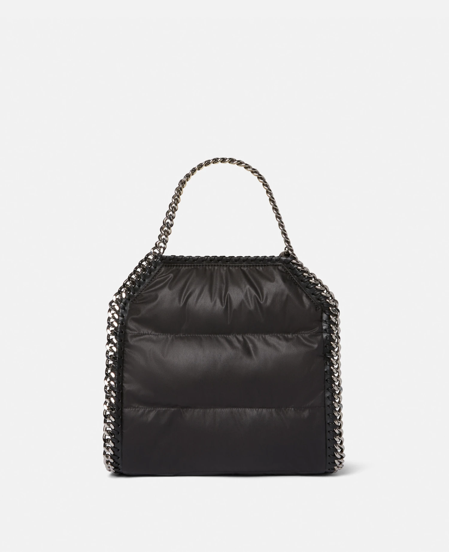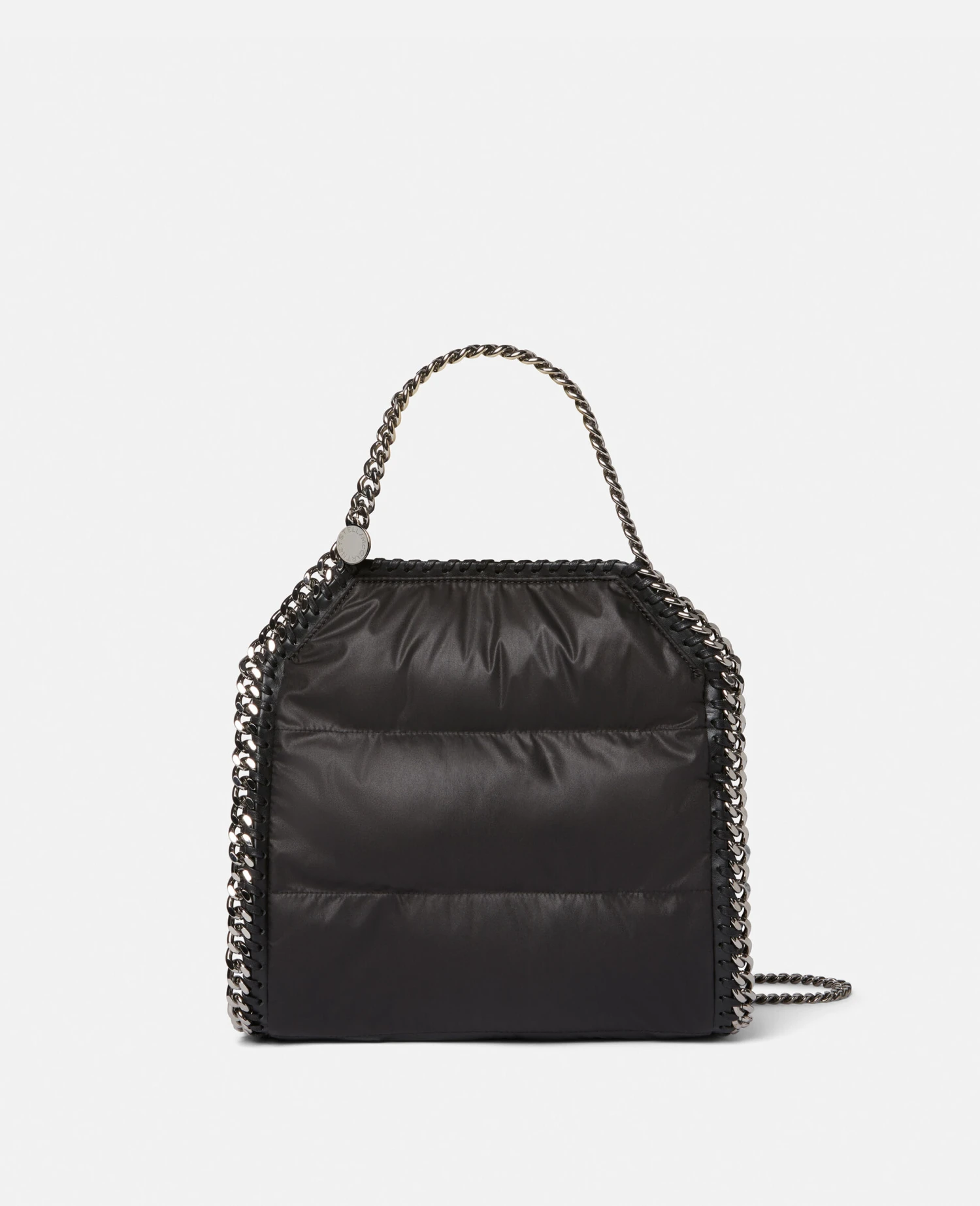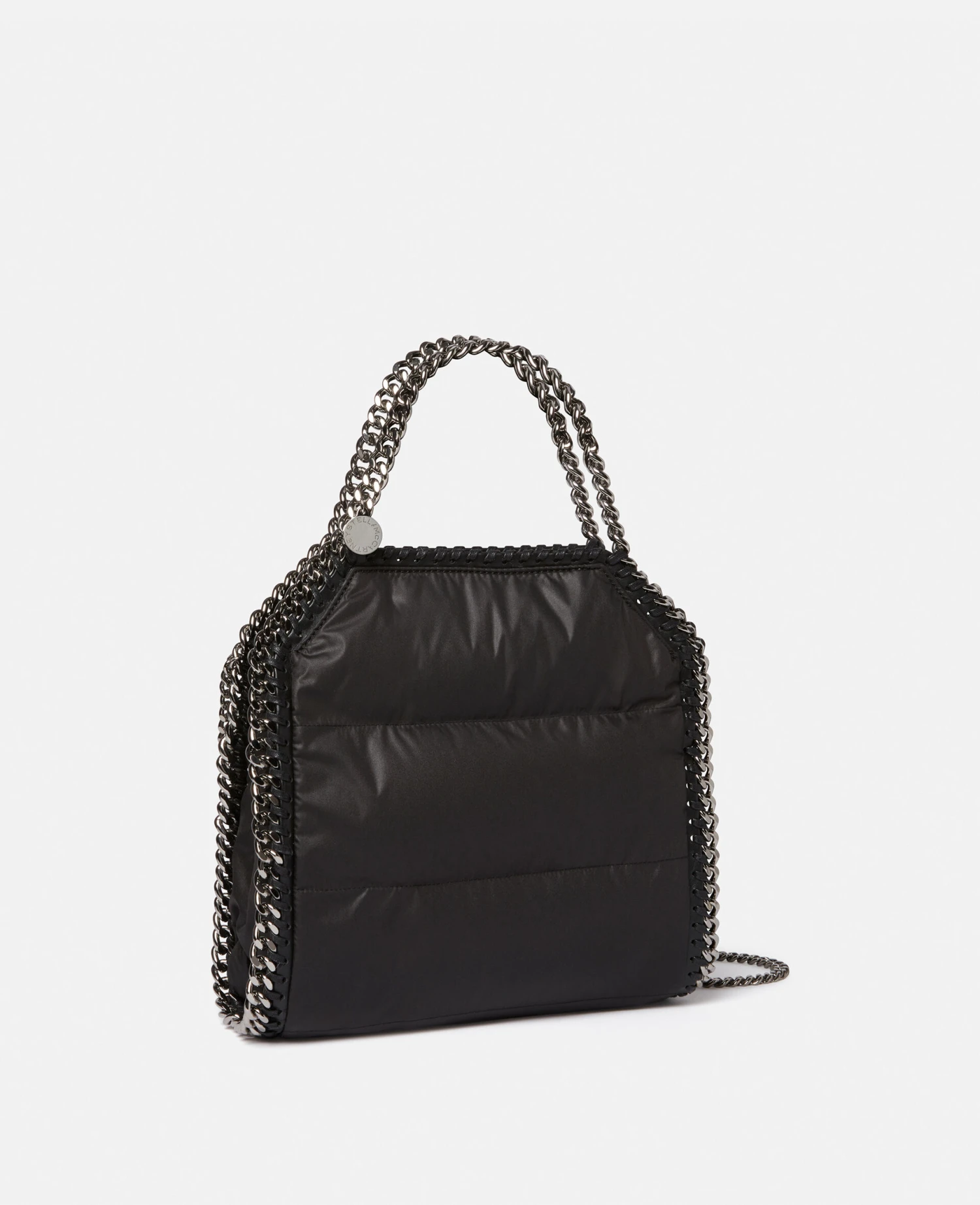 Referencing shapes from vintage furniture for Winter 222, the iconic Falabella tote bag receives a timeless update in quilted recycled nylon. The mini tote bag is instantly characterised by its signature diamond-cut chain that frames the silhouette and formulates top handles and the shoulder strap.