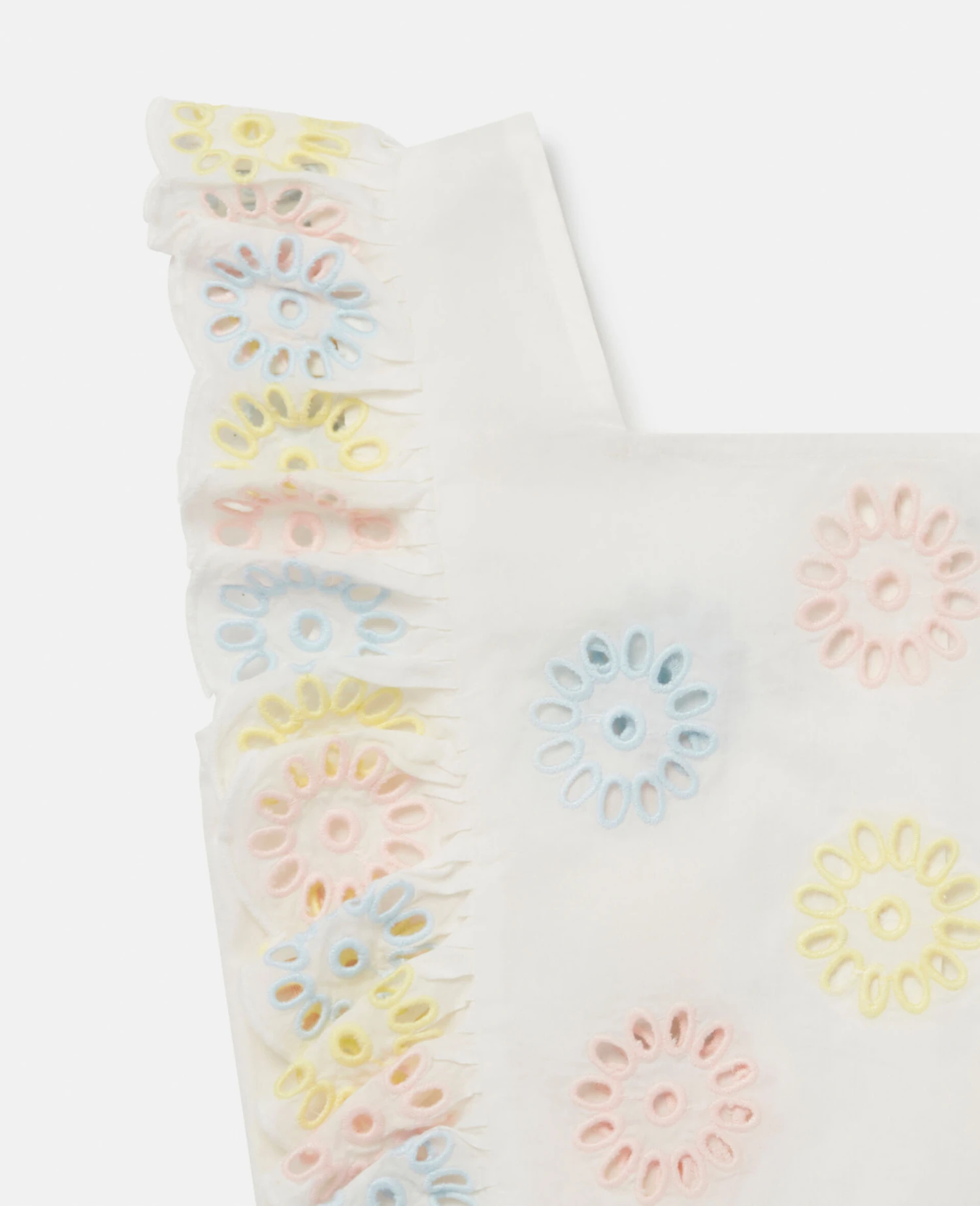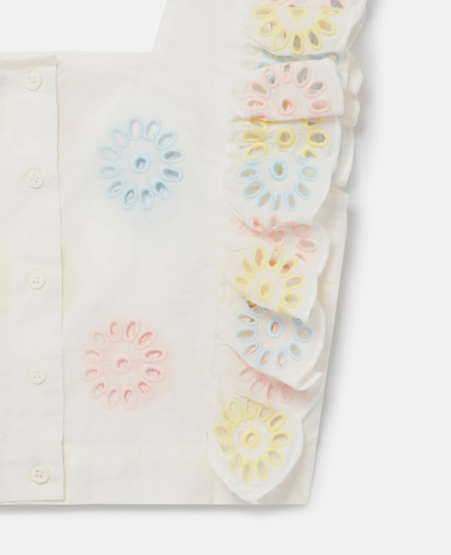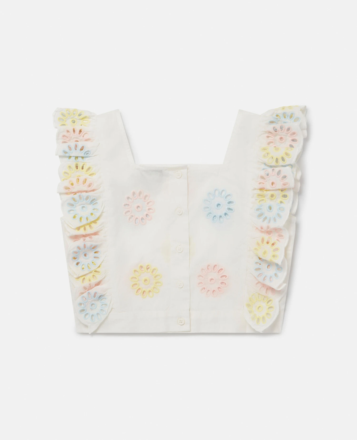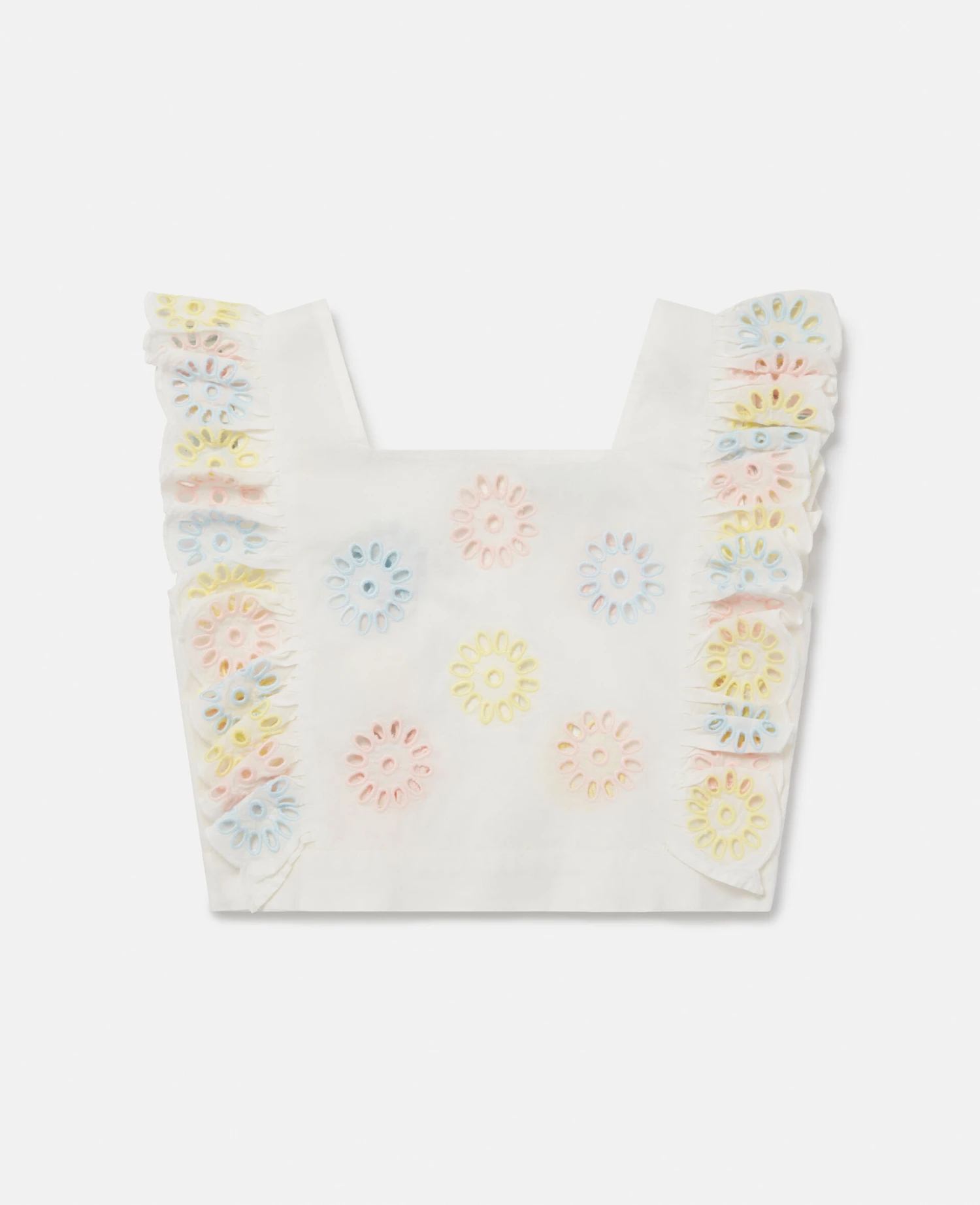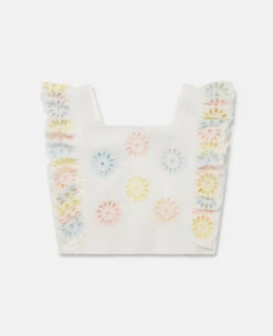Lend a flower child vibe to her Spring Summer 223 wardrobe with this sweet crop top from Stella McCartney Kids. Consciously crafted from organic cotton voile, the cropped top has pretty frill trims and an all-over pastel flower crochet pattern.