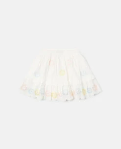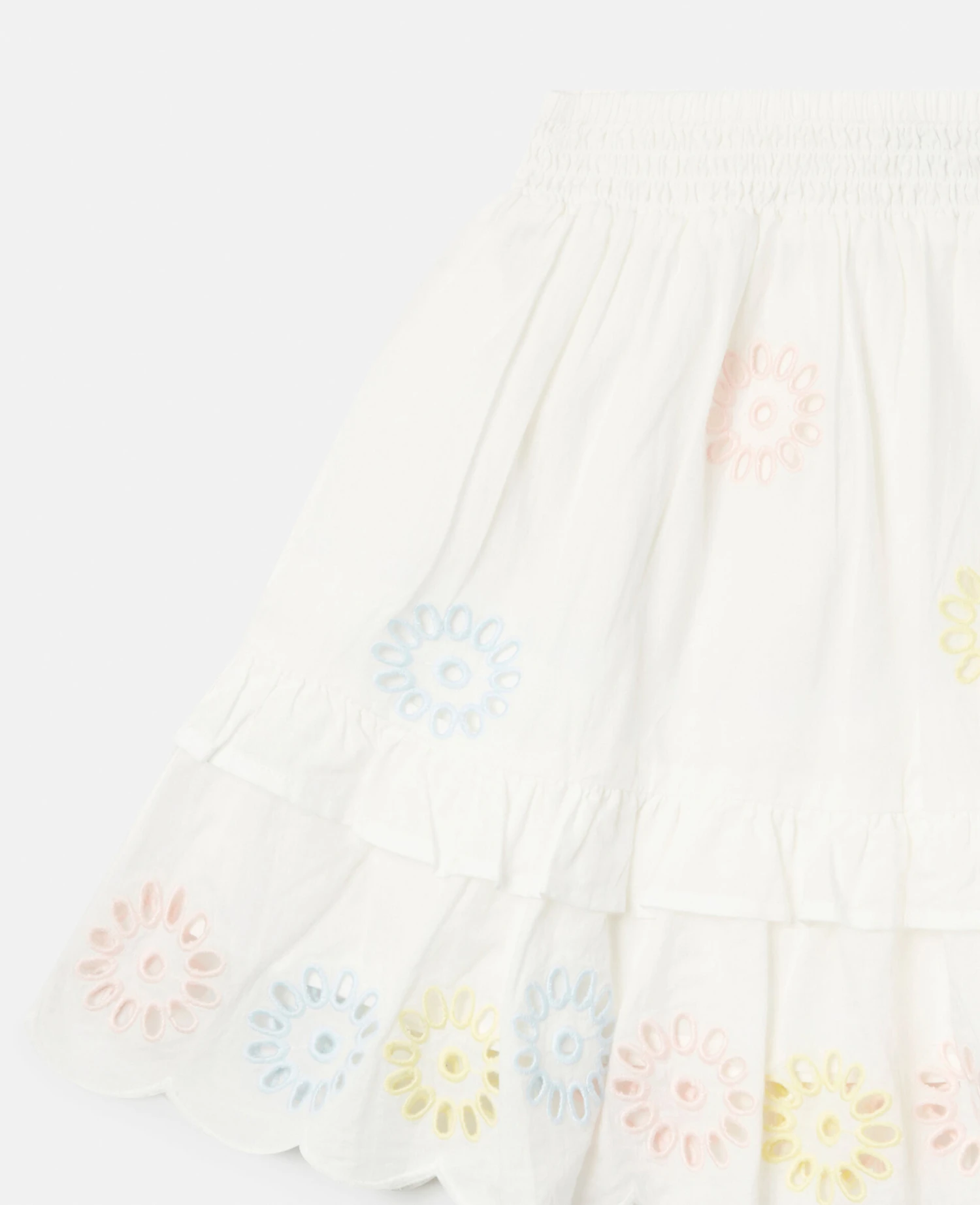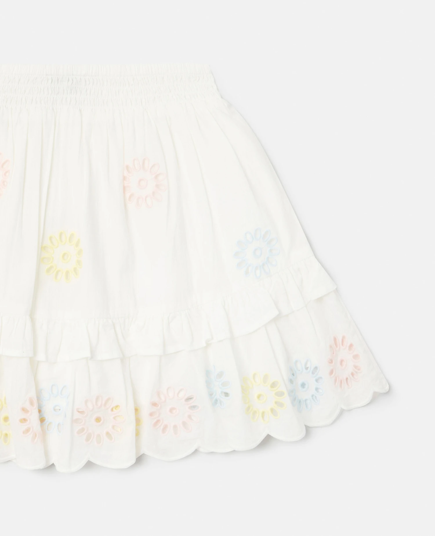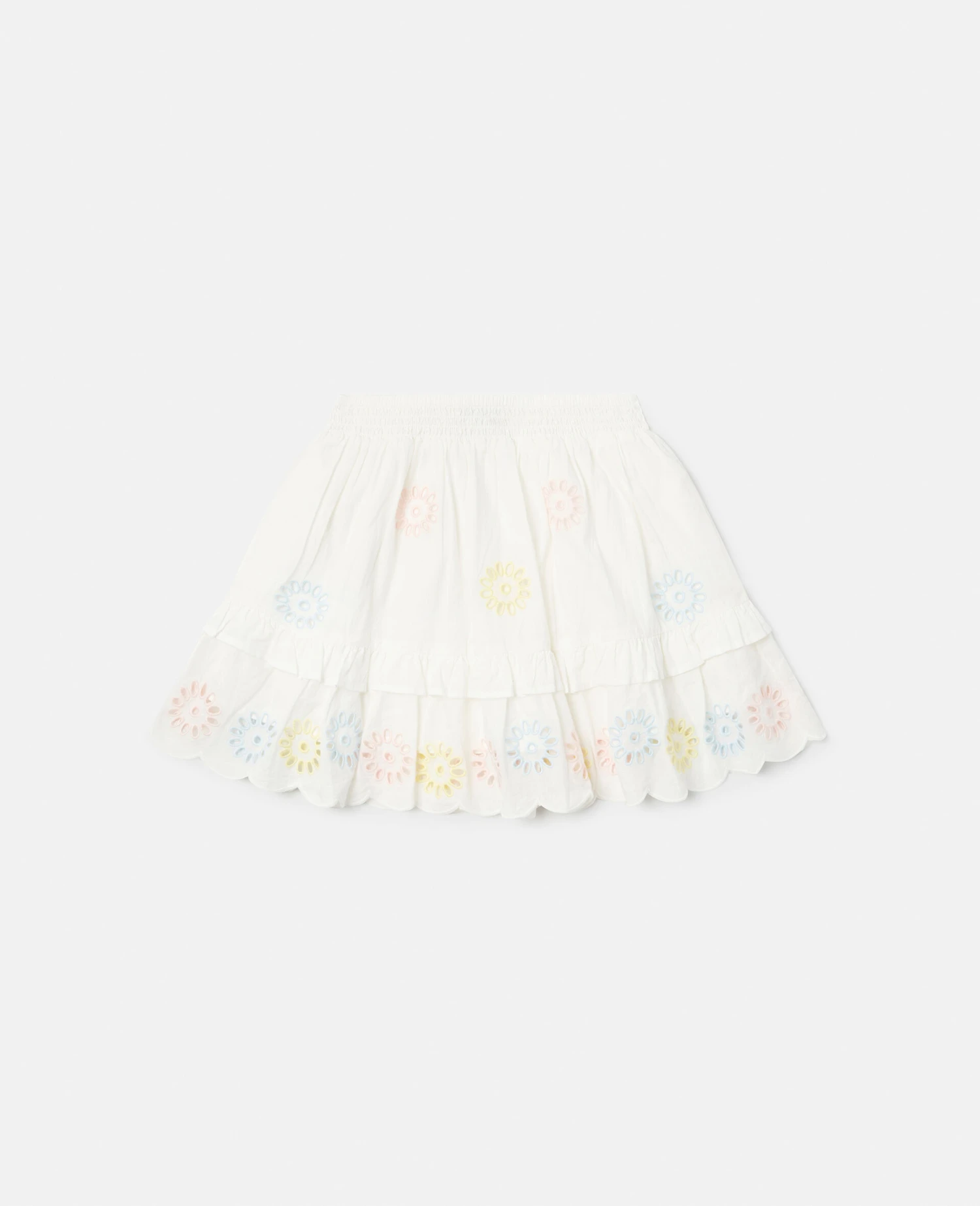 This organic cotton voile flared skirt brings a dream-like air to her Spring Summer 223 outfits. Its gathered, tiered design is elevated with girlish frilled seams, pastel crochet flowers and a charming scalloped hem.