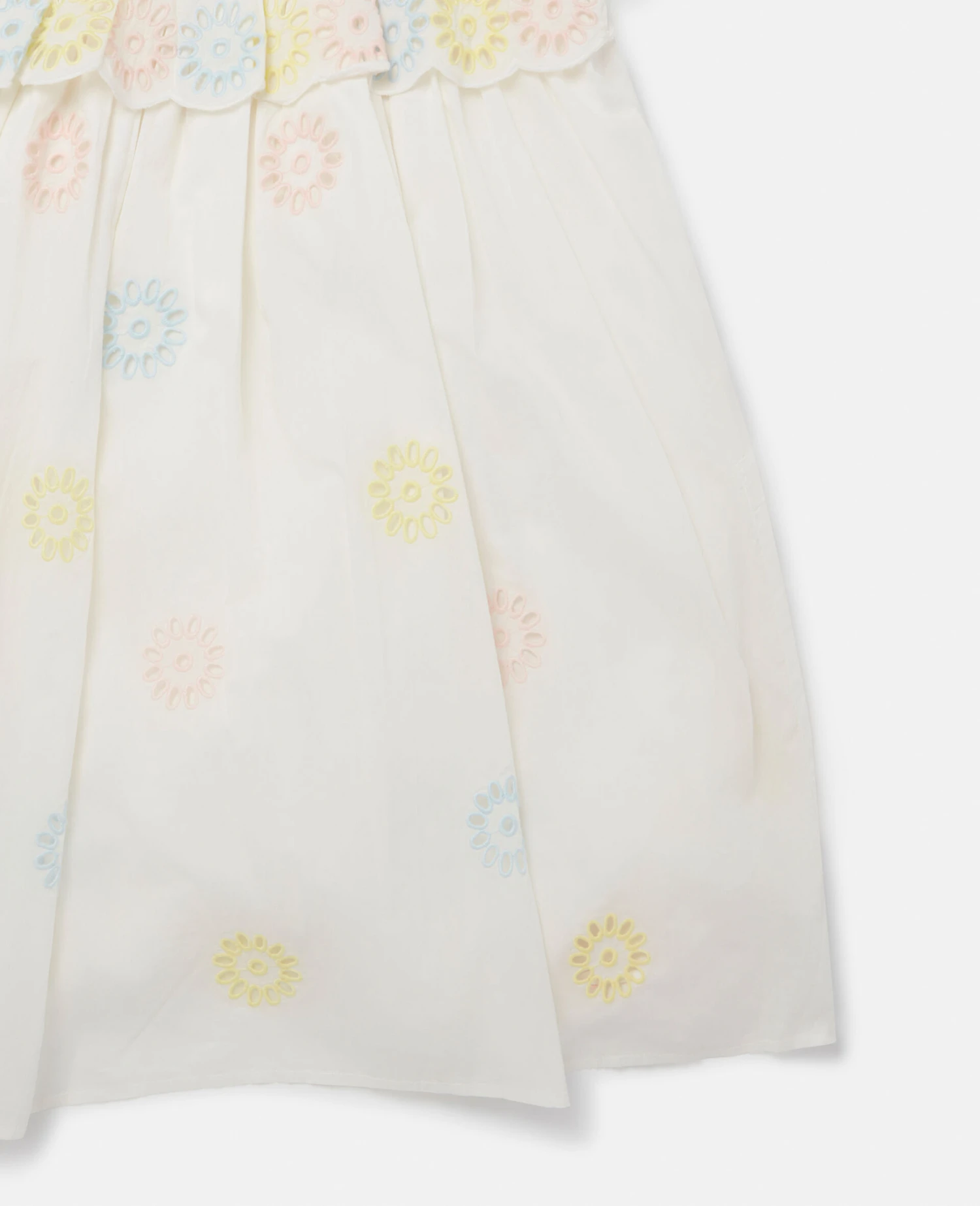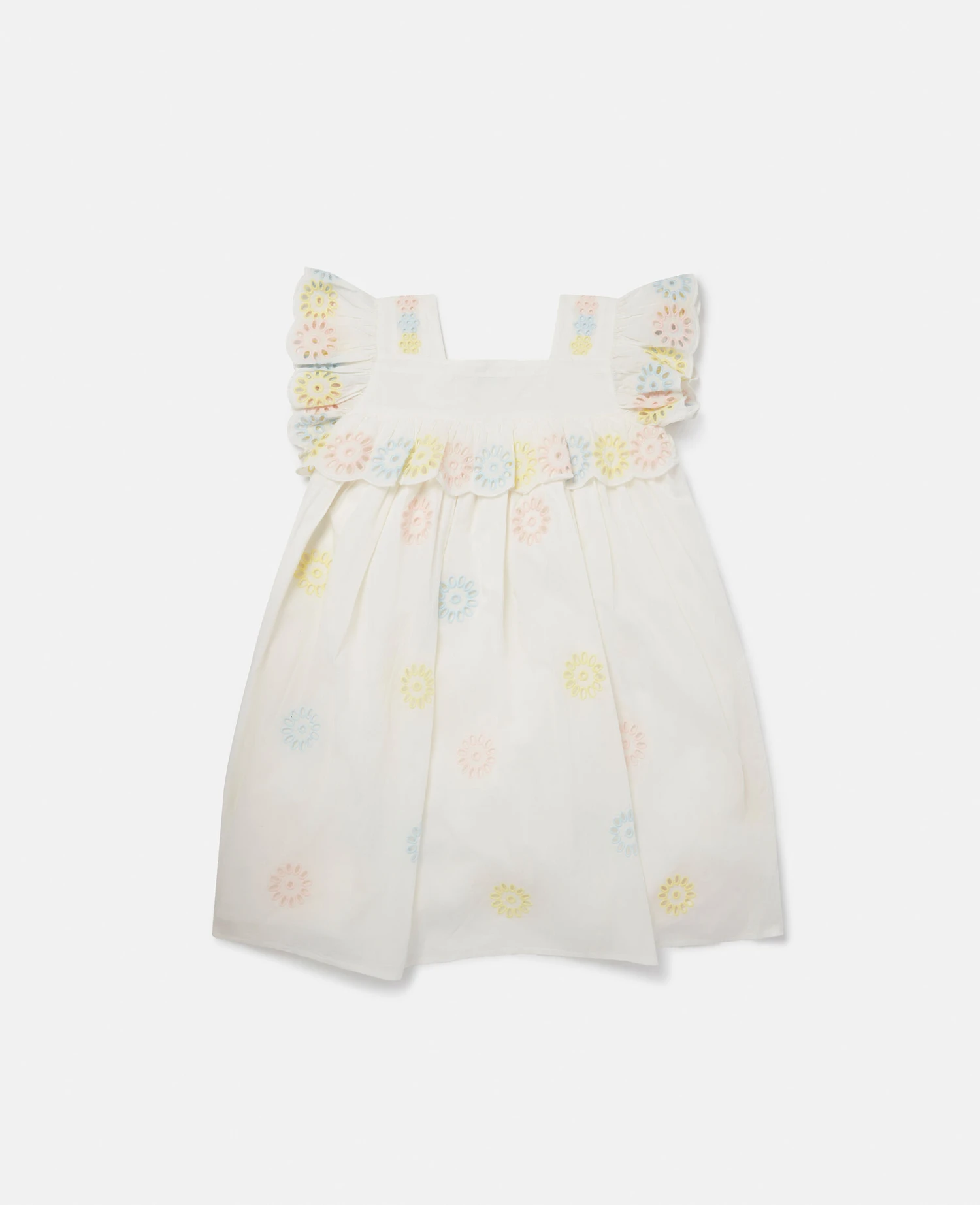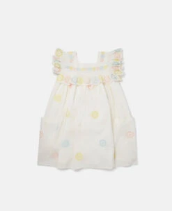 Lean into Spring Summer 223’s 7s-inspired, free-spirited hippie mood with this sweet sundress from Stella McCartney. Crafted from GOTS-certified organic cotton, the dress features pastel multicolour flower crochet details all over.