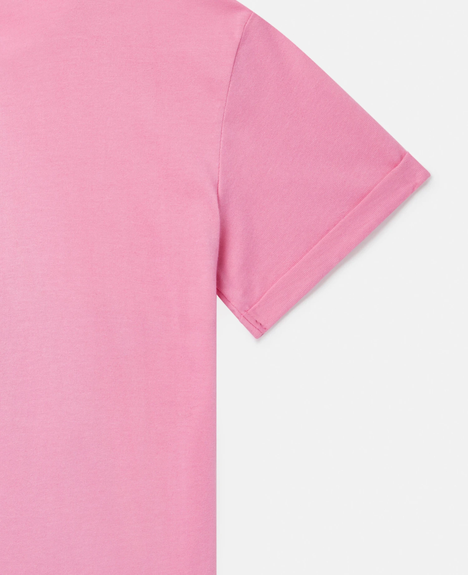 In bright, joyful bubblegum pink, this cotton jersey t-shirt adds a fun twist to her Spring Summer 223 wardrobe. The t-shirt taps into the lively attitude of the season with a colourful fringed star motif at the front.
