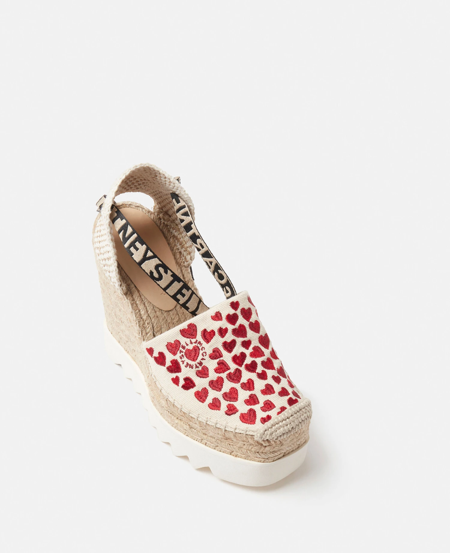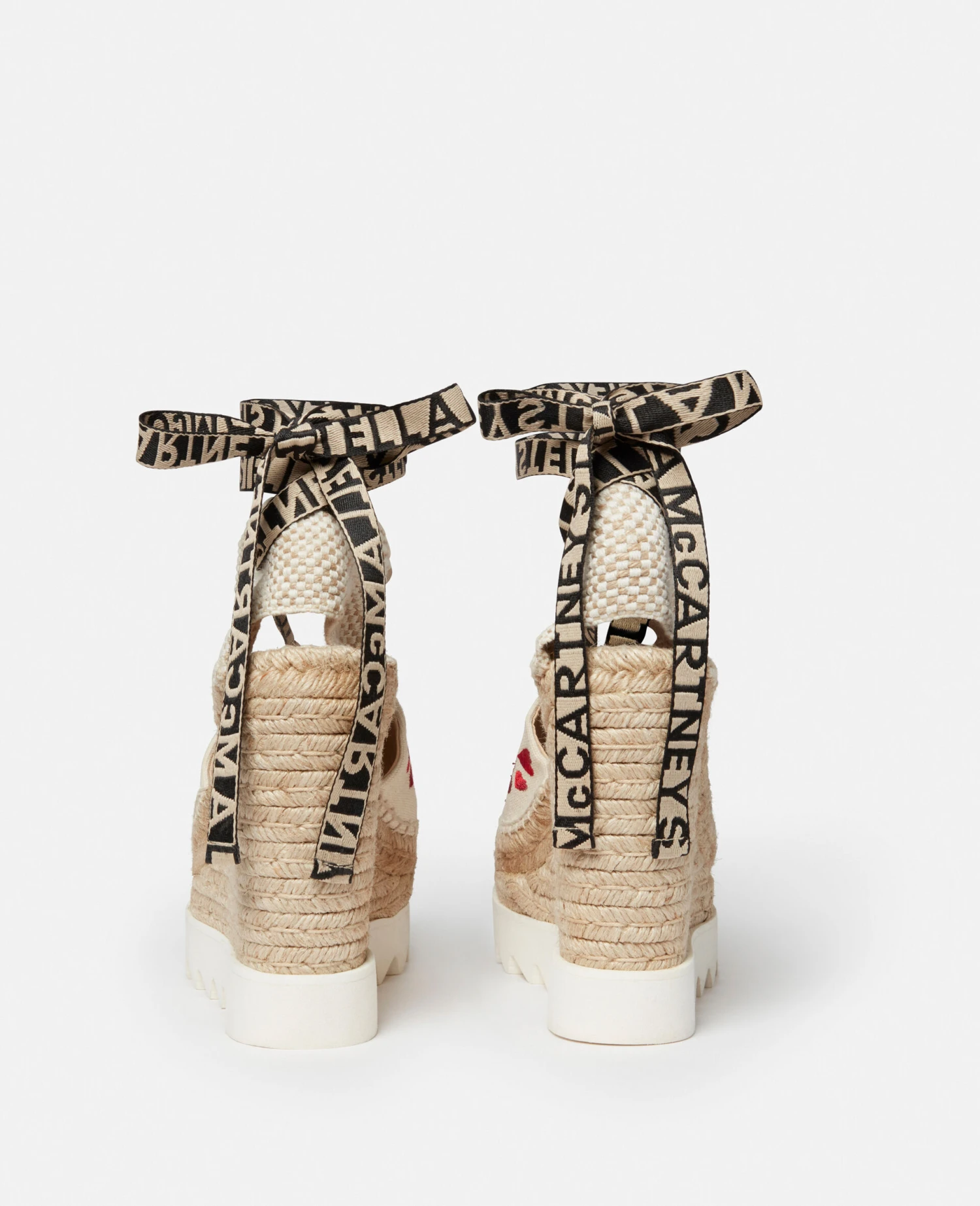 Consciously crafted from recycled cotton, these Gaia wedge espadrilles step up the Summer of Love capsule’s warm-weather romance. The espadrille wedges have a cherry red heart-print upper and feature an iconic saw-edge microsole and Stella McCartney logo ribbon ankle lace-up fastening.