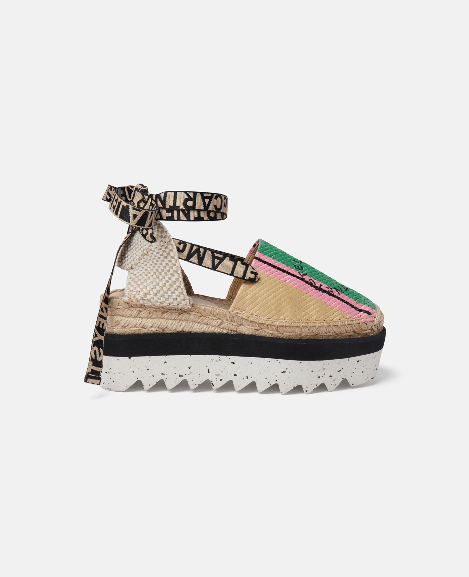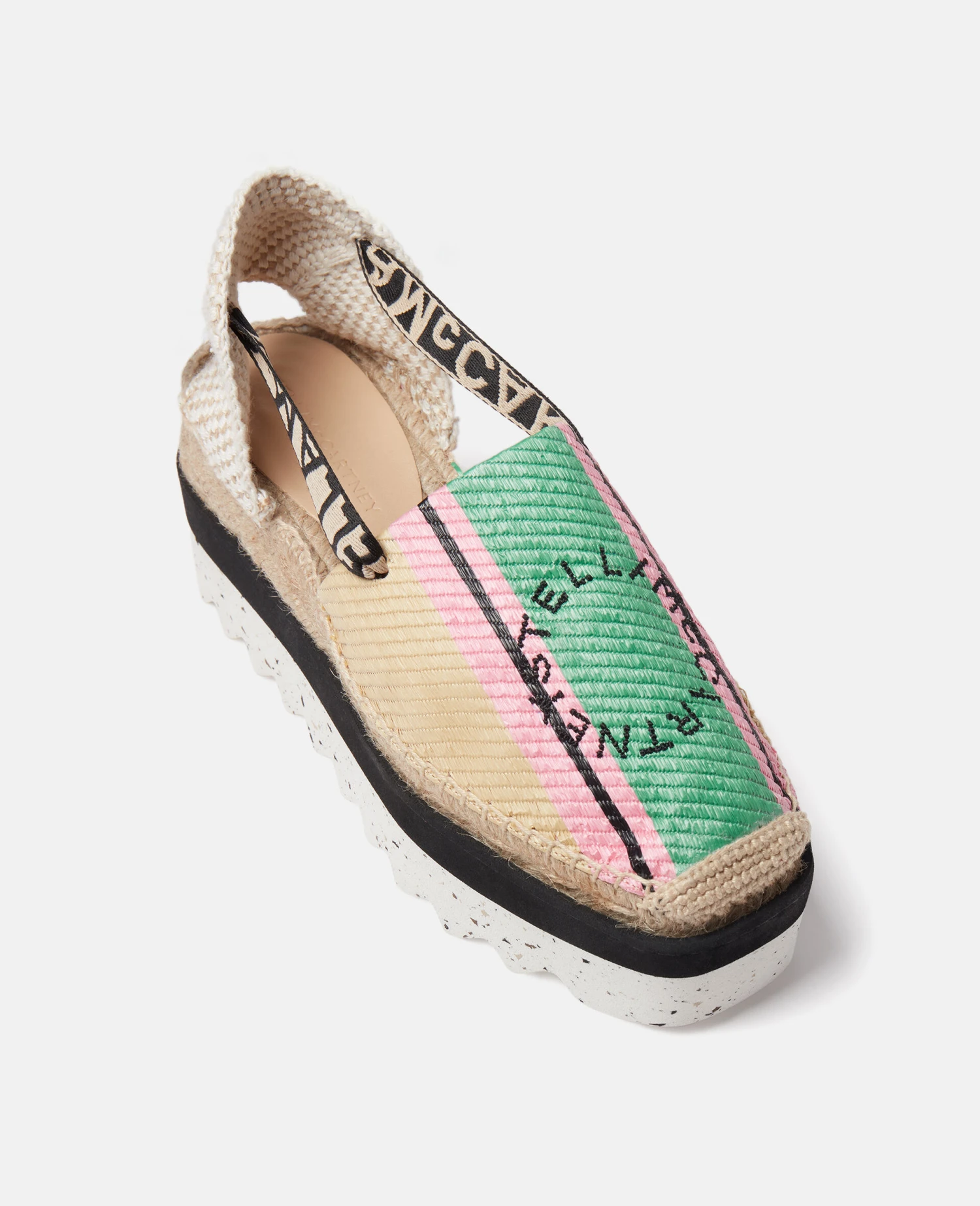 Elevate the everyday through Spring 223 with these Gaia platform espadrilles in raffia. The espadrilles feature a vibrant striped design and crochet back heel panel, brought together by its logo canvas ribbon and speckled saw-edge micro sole.