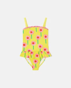 Stella girls go on a playful adventure for Spring Summer 223 and this yellow swimsuit is a joyful example.The swimsuit is crafted from recycled materials and finished with SPF5 sun protection, spaghetti straps and a contrast frill trim.