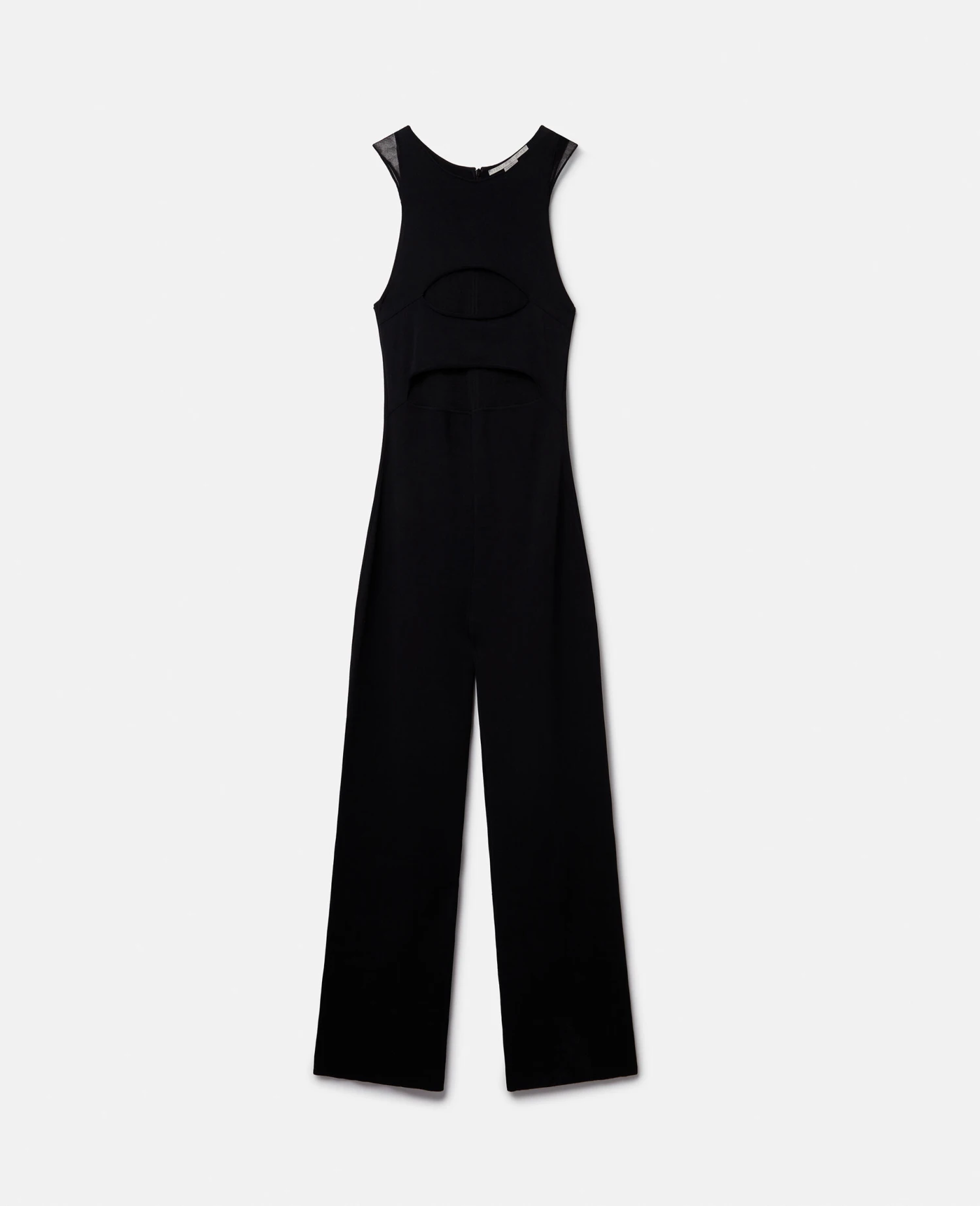 The signature Stella jumpsuit returns with a peek-a-boo twist. In midnight black compact knit, this all-in-one features a crew neck and wide leg cut, deftly elevated by two mesh inserts.
