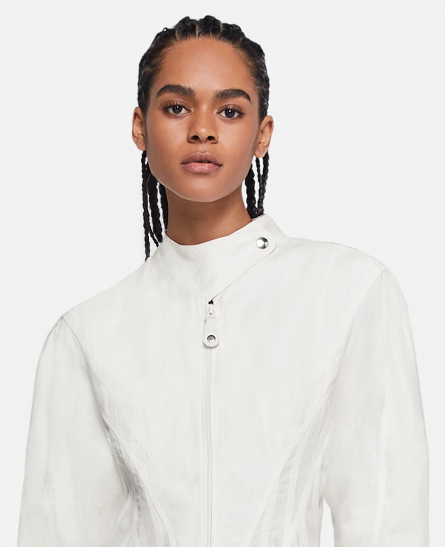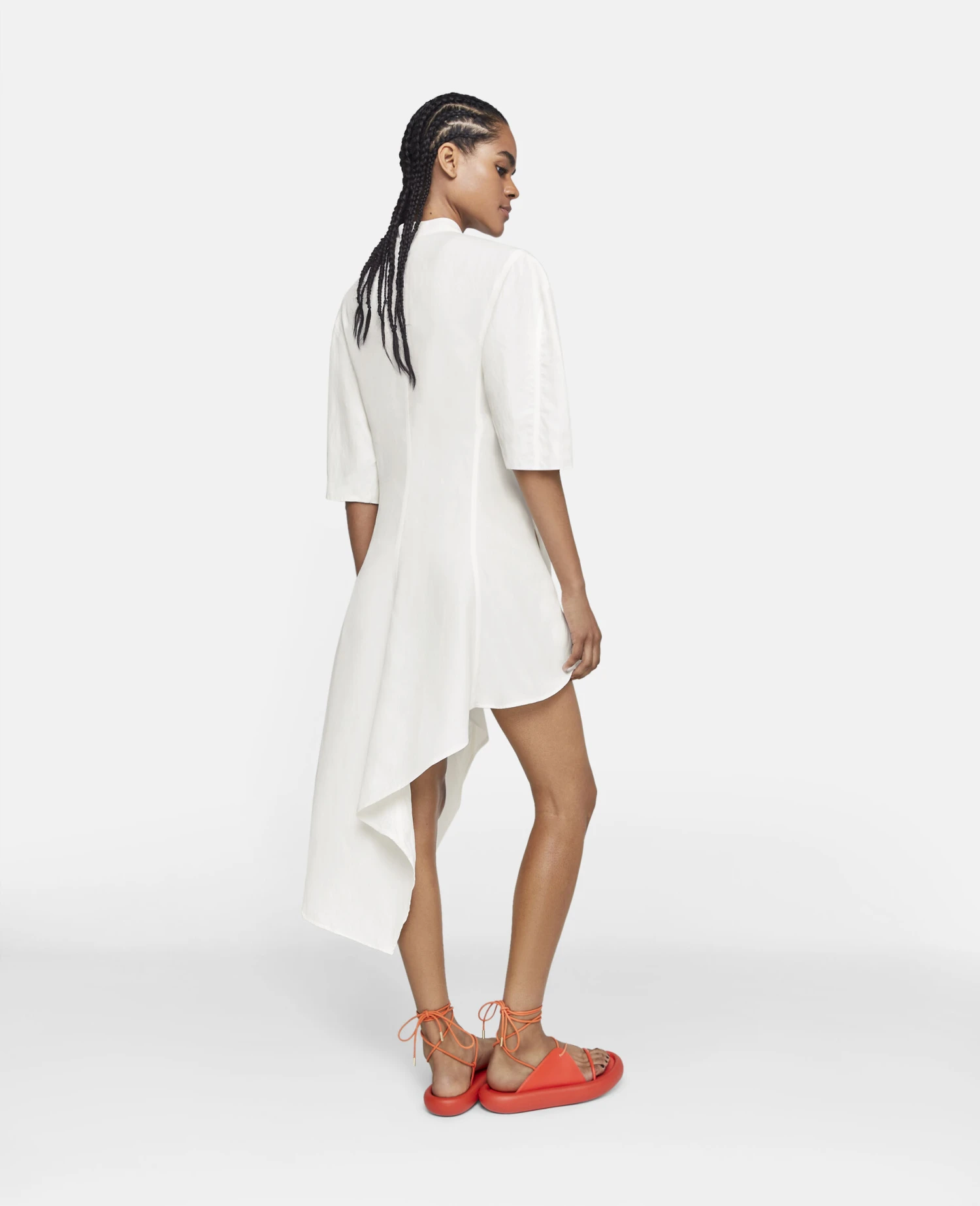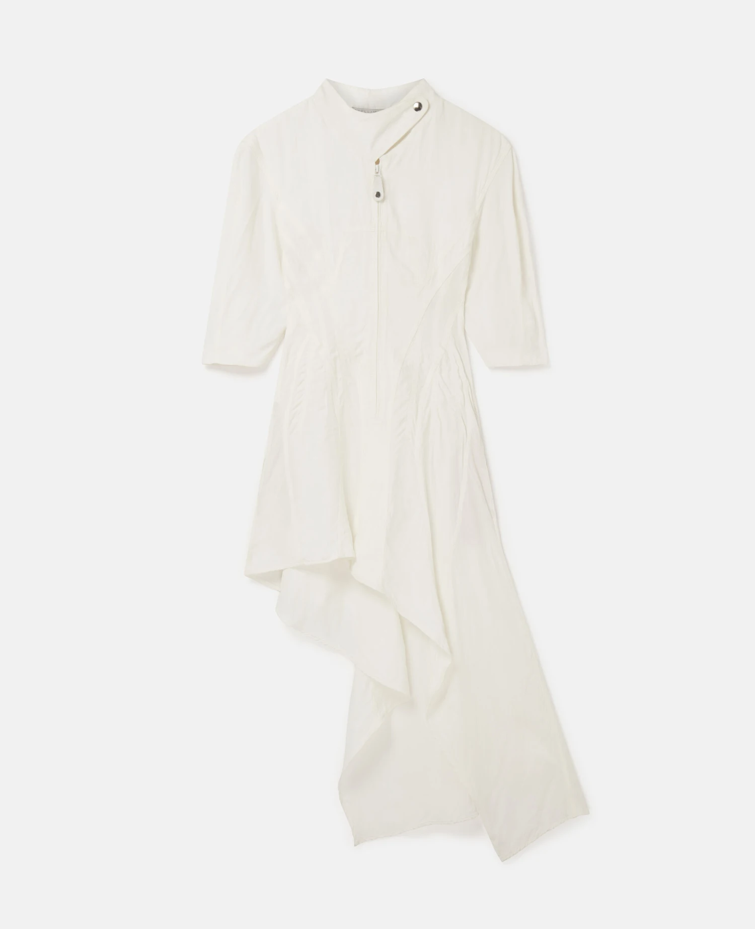 This chalk white shirt dress echoes the season’s minimal sensuality with a softly corseted bodice. Collarless with a utilitarian popper and elbow-length sleeves, this dress elevates a classic silhouette.