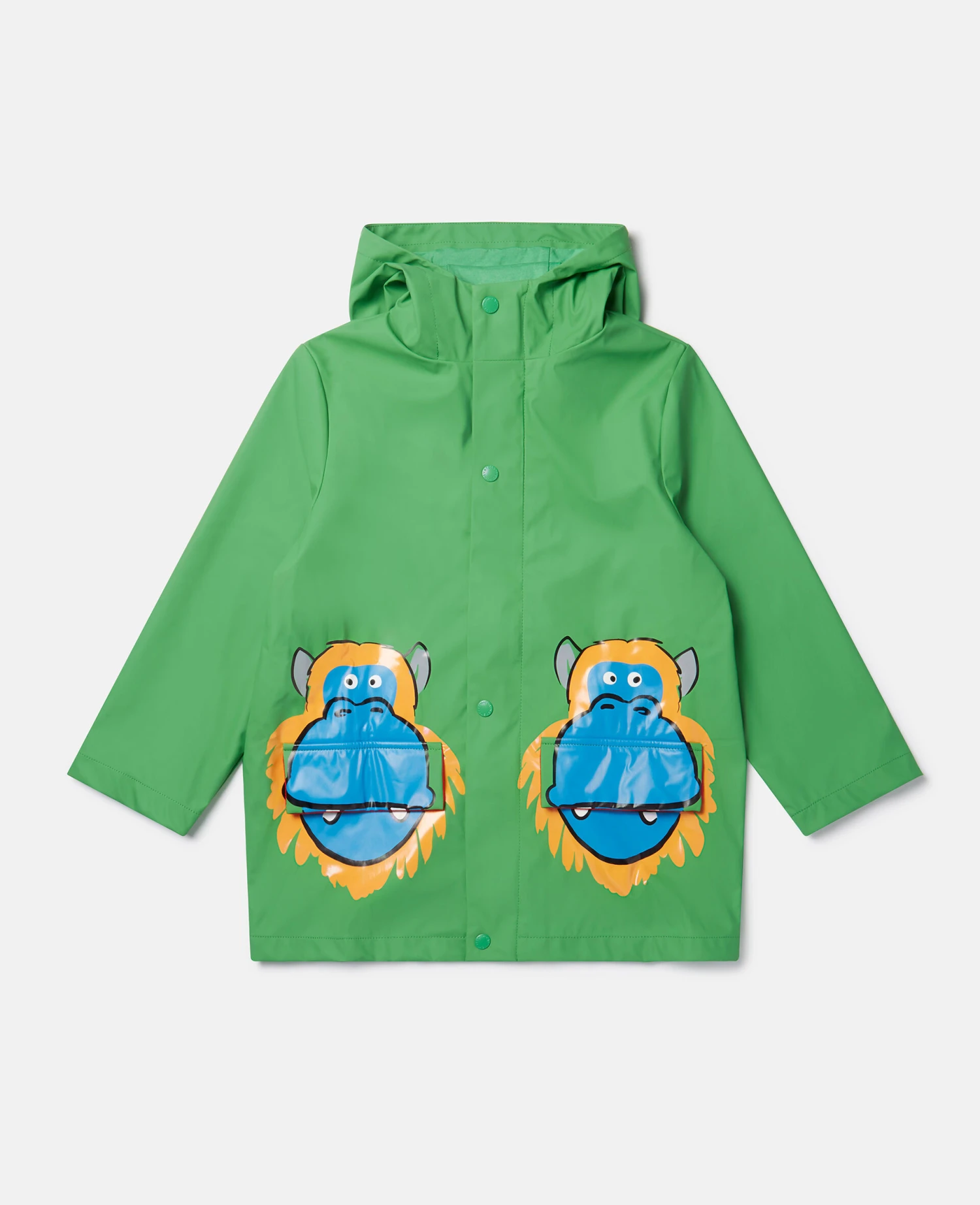 Shelter from rain showers in this hooded, rubberised jacket from Stella McCartney Kids. Crafted from recycled polyester with a matte rubber finish, the jacket is a practical choice with its hood, button placket and little front pockets, decorated with orangutans.