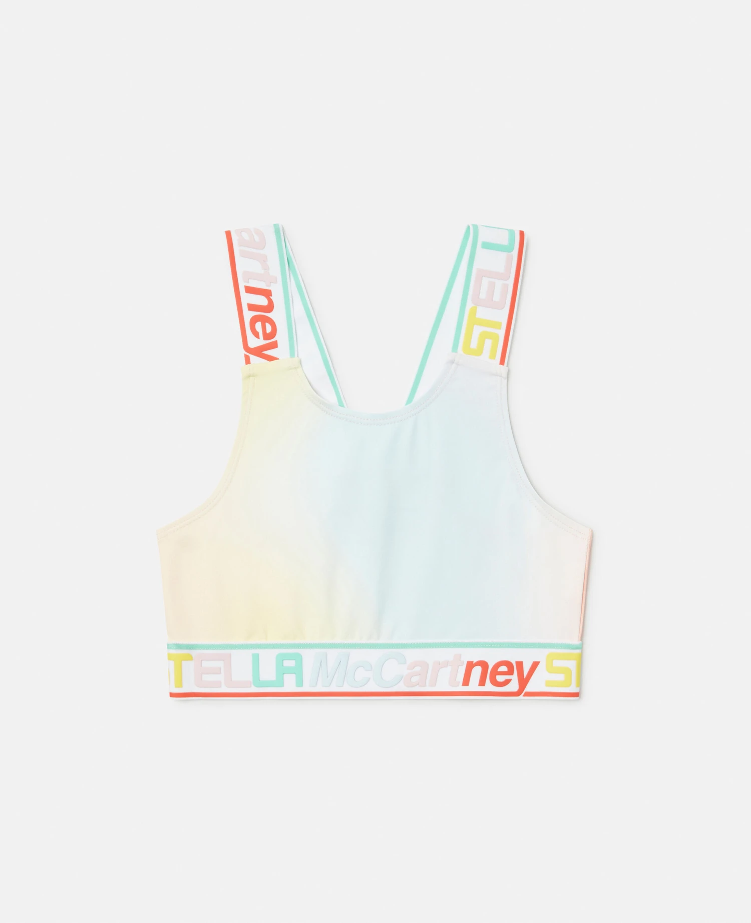 For Stella kids that are full of energy, this ombré print crop top is made from stretch polyamide jersey. The spray-inspired design features an all-over sage, sky blue and rose pink ombré with a logo tape underband.