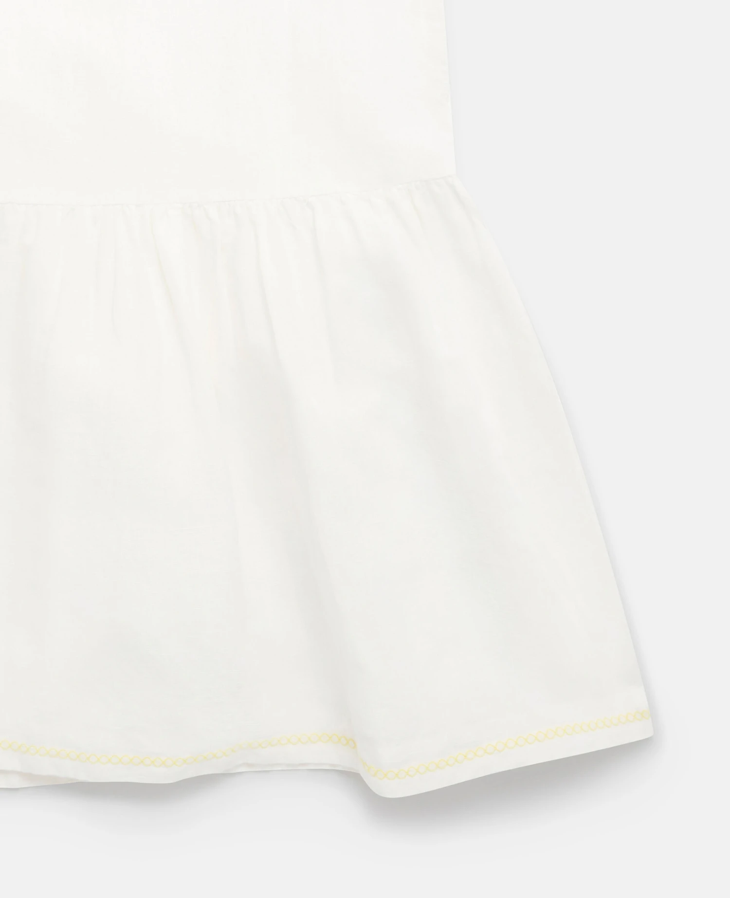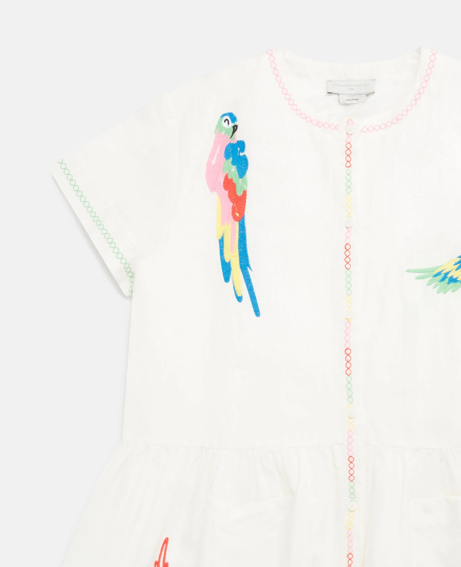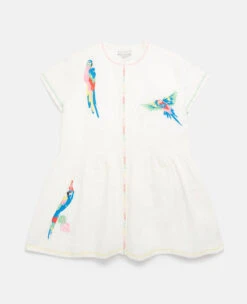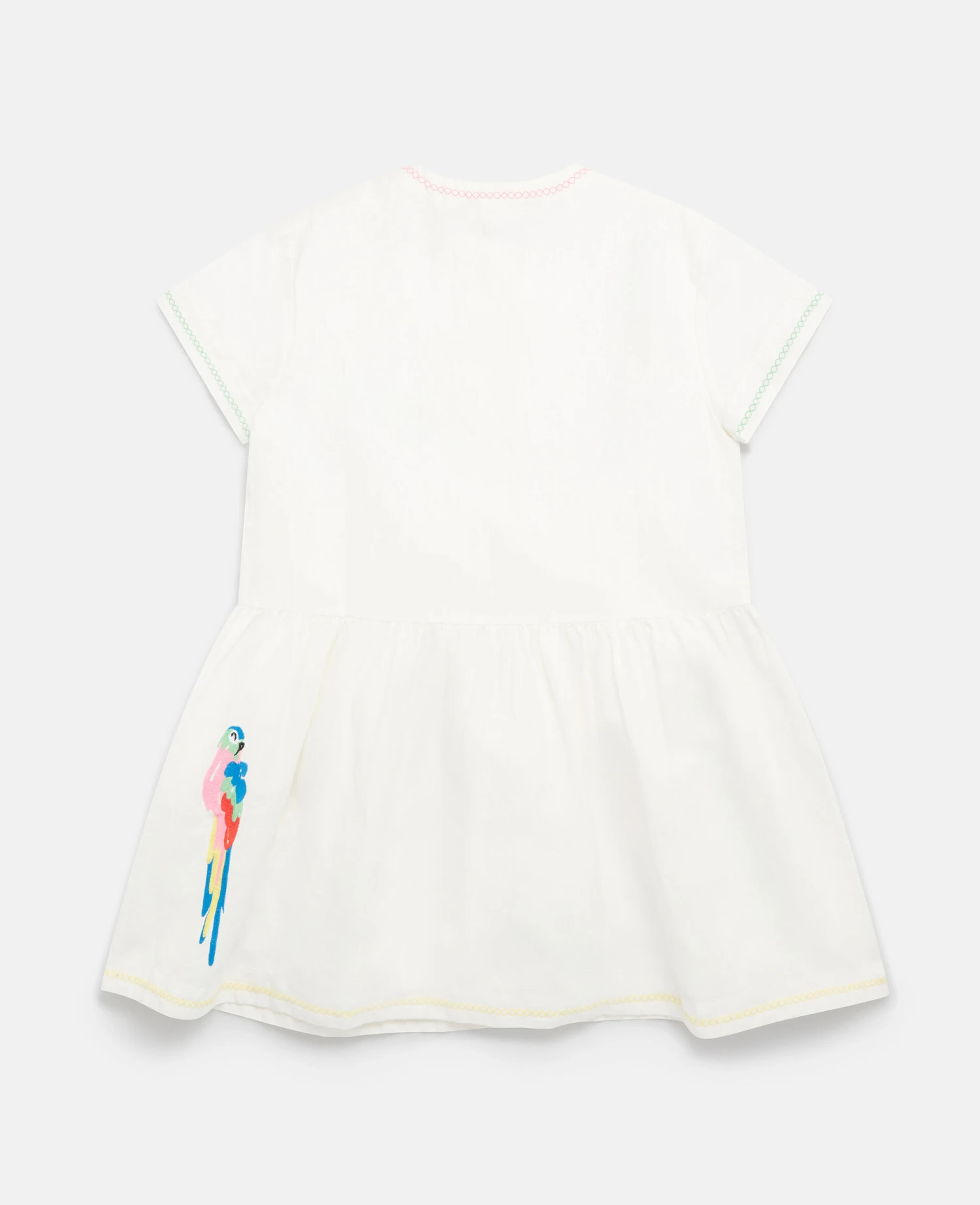 For Spring Summer 223, Stella McCartney Kids returns to its playful roots. This white linen-blend dress is decorated with colourful embroidery edges and vibrant parrots at the front.