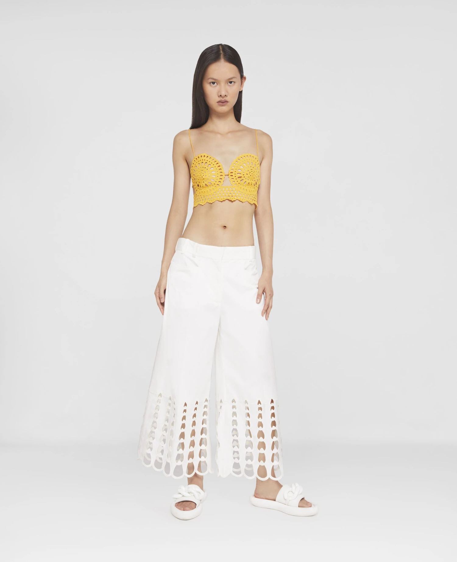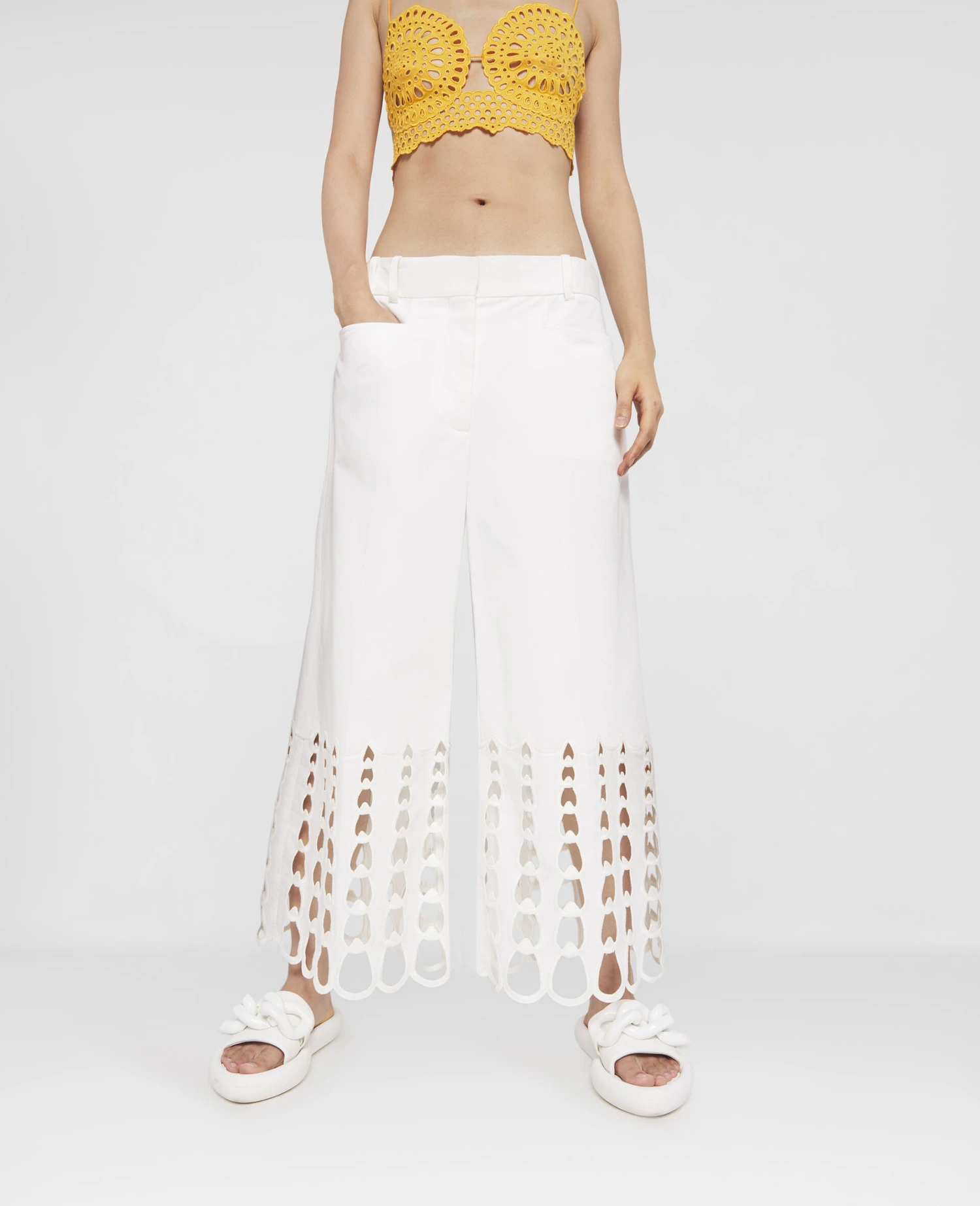 A delicate balance of springtime nostalgia and youthful naïveté, these culotte trousers have a playful broderie anglaise style. The trousers are consciously crafted from polished cotton crochet with a sheer cutwork hem. Match it to a cropped top and Elyse platforms.