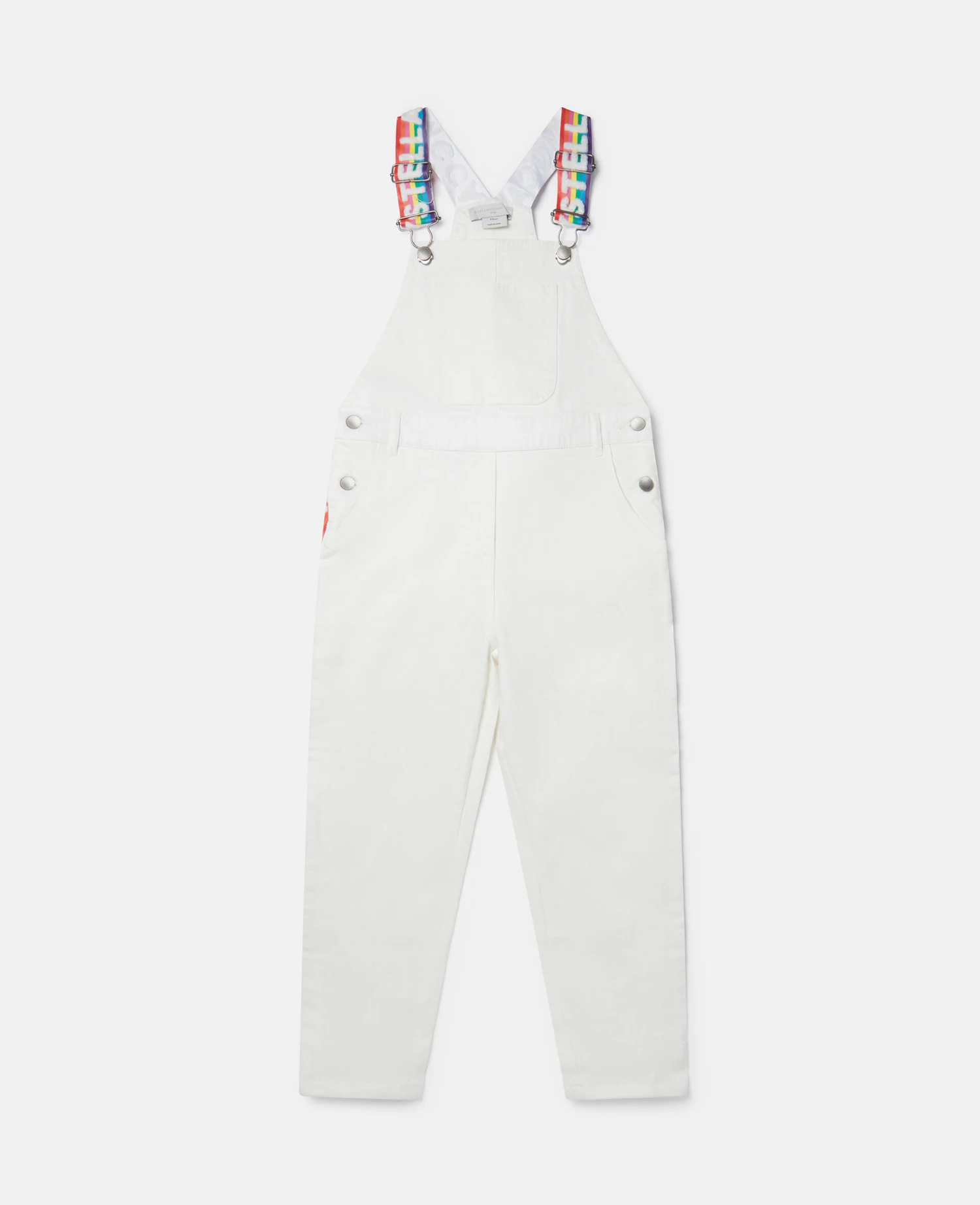 These white dungarees from Stella McCartney Kids are consciously crafted from organic cotton gabardine. In a classic denim style, the dungarees have five-pocket styling and metal hook fastenings. The dungarees are elevated by striking Stella McCartney logo tape in vibrant rainbow hues.