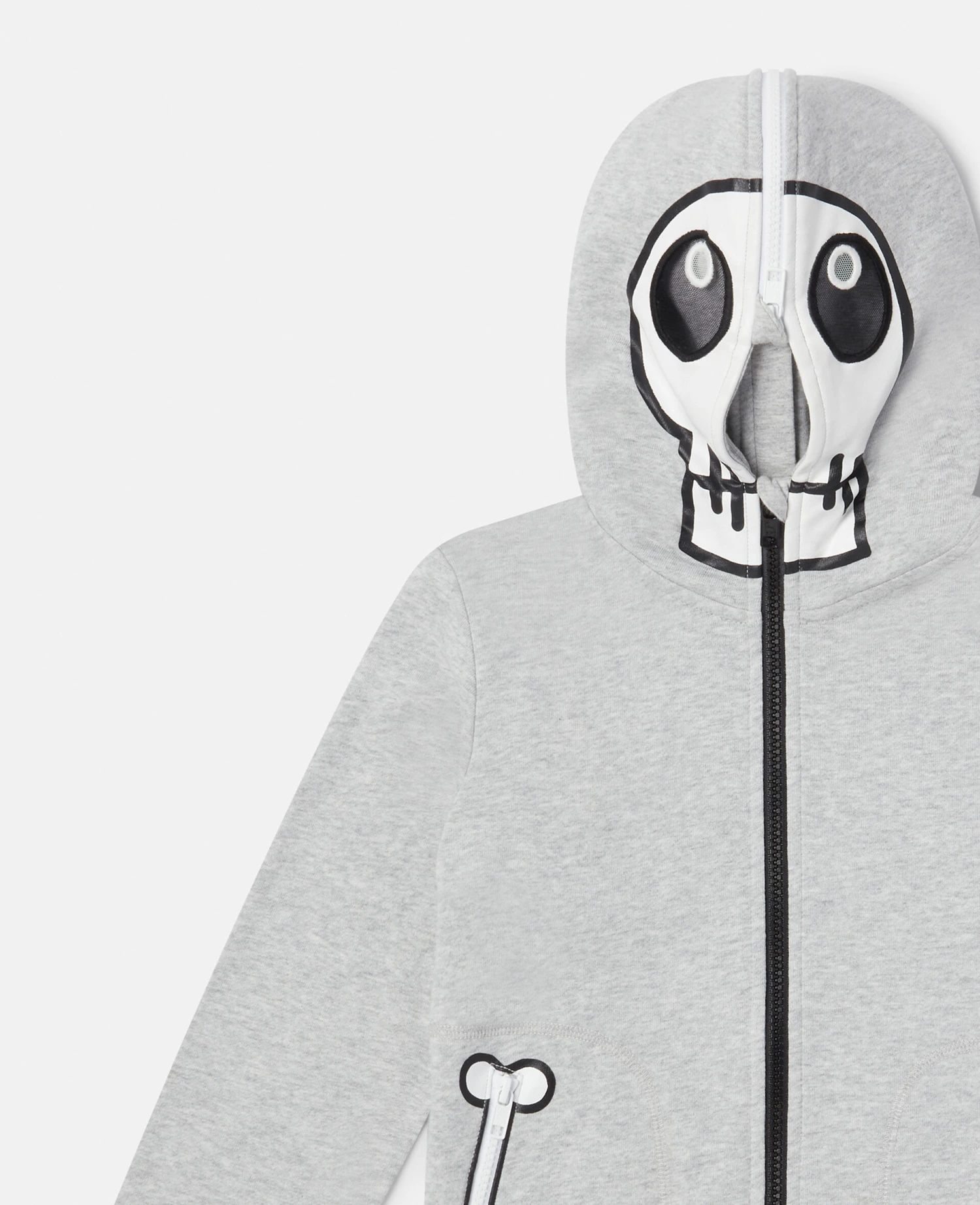 - Black and white skull bandit print at hood