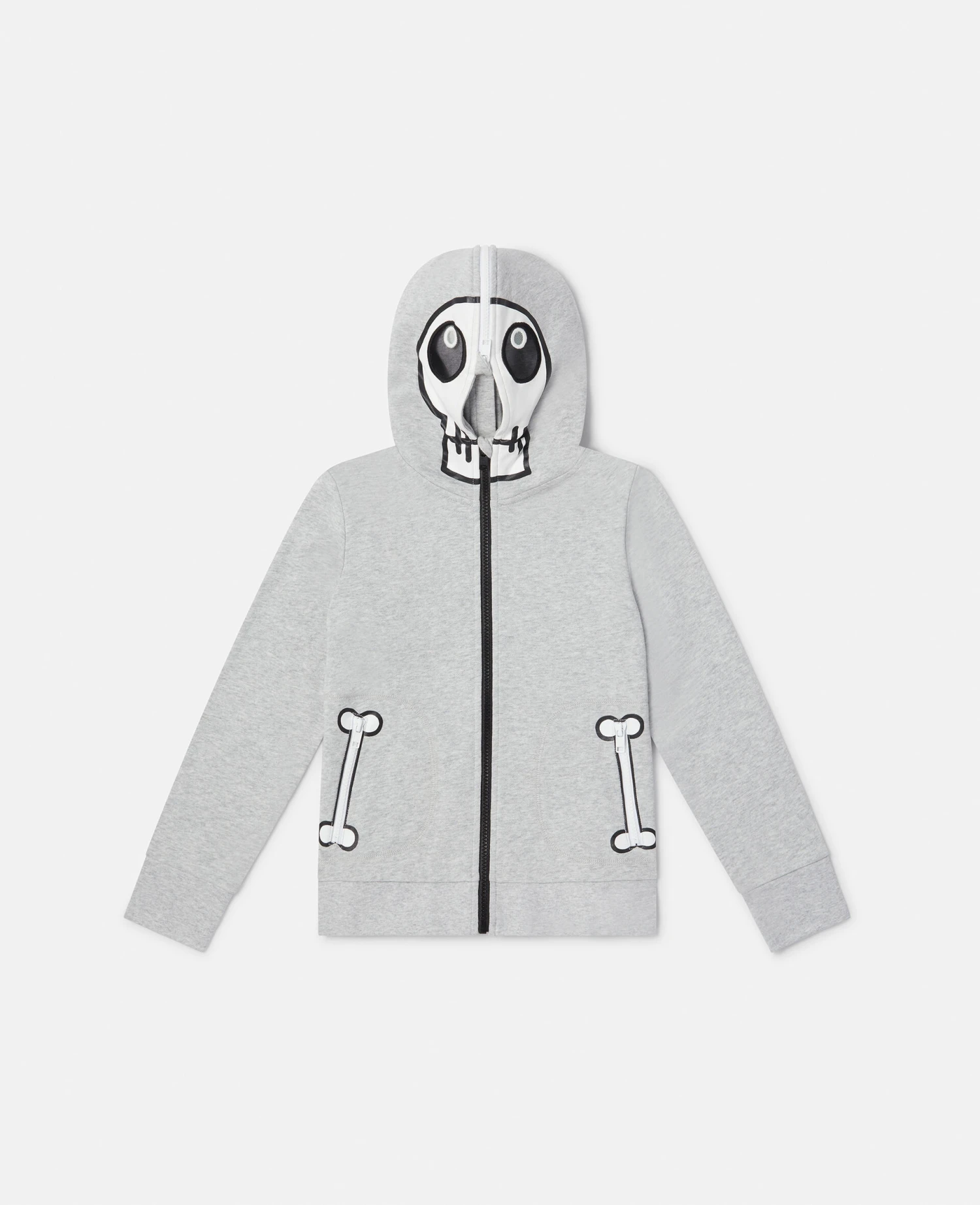 A silly skull bandit on the hood makes this hoodie a cheeky addition to his Spring Summer 223 wardrobe. Crafted from light grey marl organic cotton fleece, the hoodie has bone prints at the pocket openings – an extra fun touch.