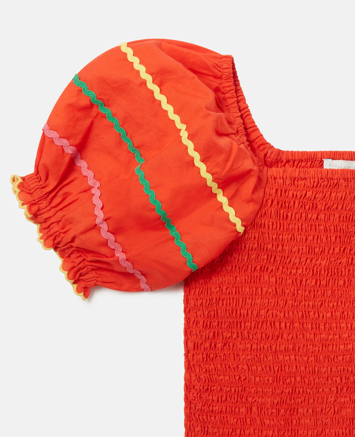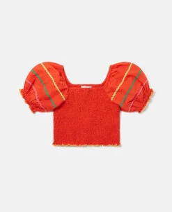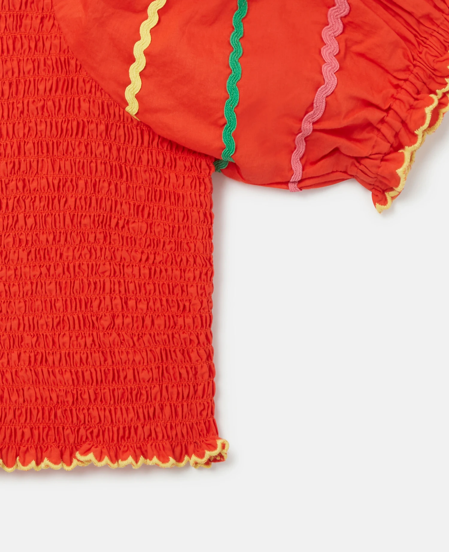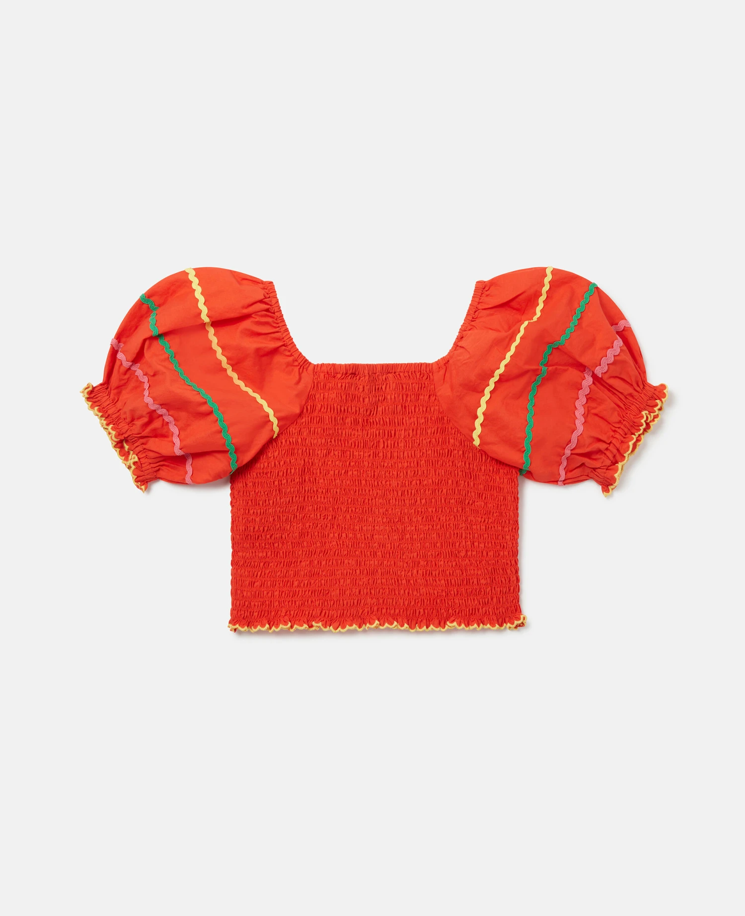Bring a taste of summer to their wardrobe with this embroidered crop top from Stella McCartney Kids. The bright red cropped top features a stretch shirred bodice and squiggle line puff sleeves.