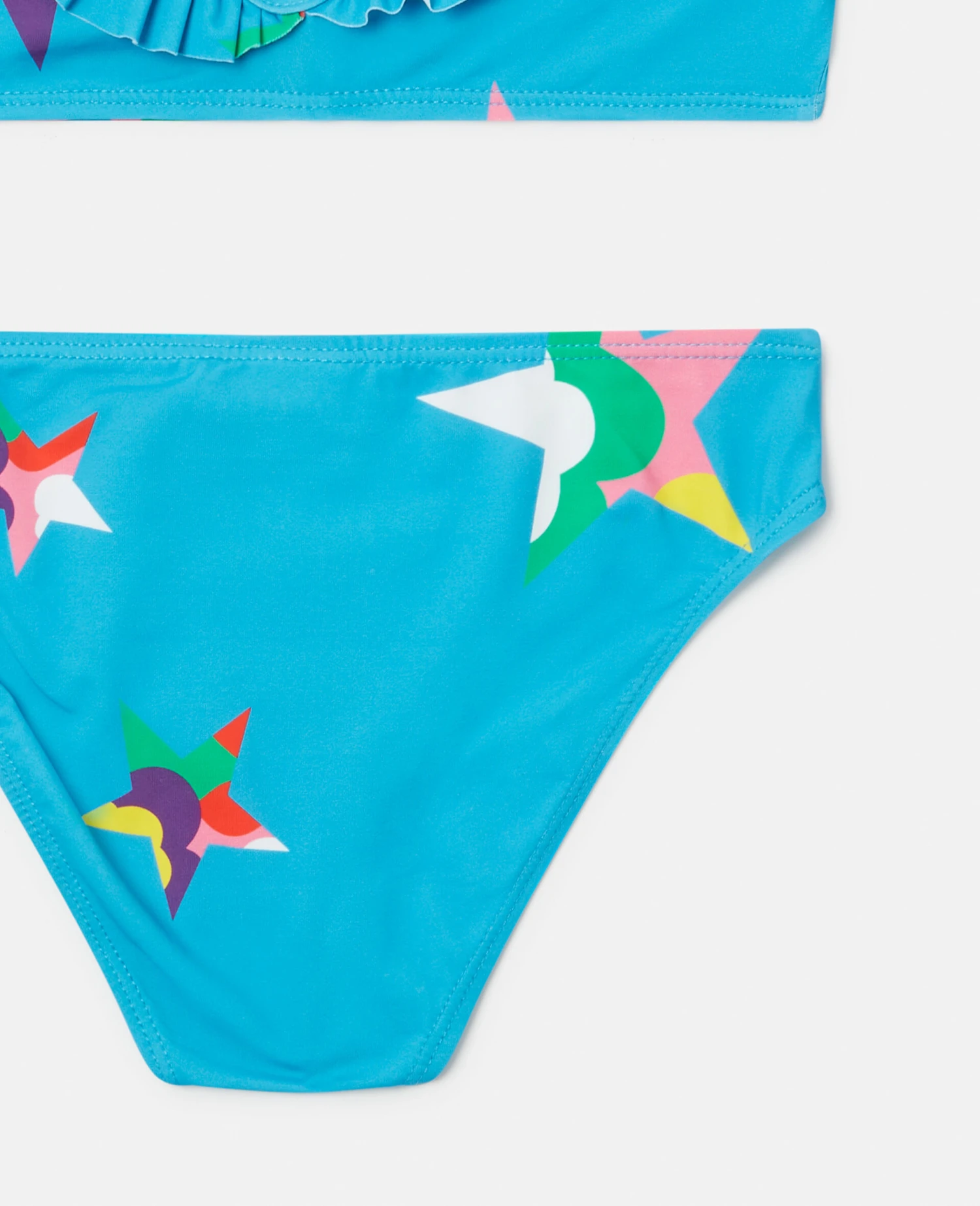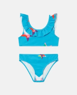 Capture a starry-eyed appeal with this star print bikini from Stella McCartney Kids. The bright cerulean blue bikini set features a ruffle trim and all-over multicolour Stella star print.