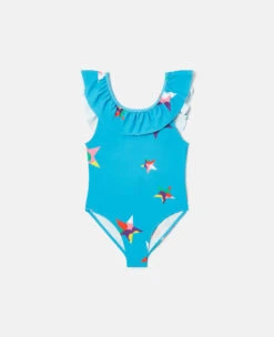 In striking blue, this ruffle trim swimsuit from Stella McCartney Kids is a lively choice for their summer travels. The swimsuit has an all-over multicolour Stella star print.
