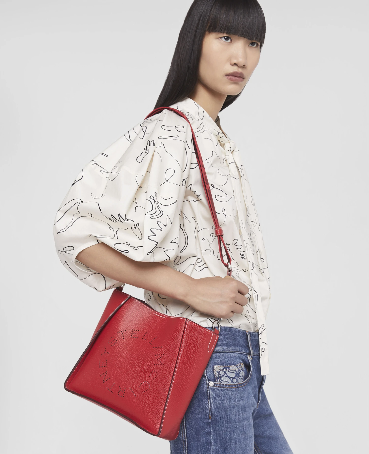 Usher in Spring 223 with this Stella Logo shoulder bag in bright red. Responsibly made from grained Alter Mat, a cruelty-free alternative to leather, the bag features a perforated, circular Stella McCartney logo at the front and a tactile canvas shoulder strap for an effortlessly utilitarian look.