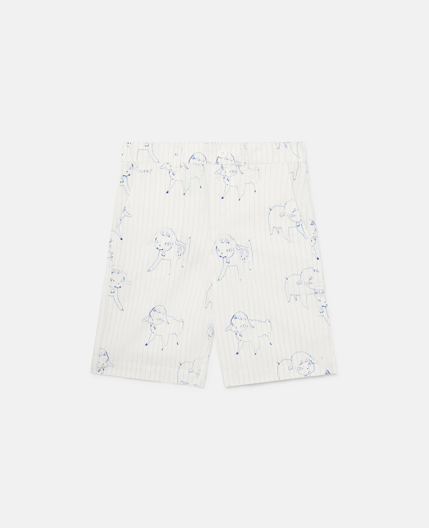 Lighten up their look for Spring Summer 223 with these organic cotton poplin shorts from the Yoshitomo Nara × Stella McCartney capsule. The ivory shorts have light grey pinstripes and an all-over print inspired by the legendary Japanese artist’s ‘Untitled’ sheep artwork.