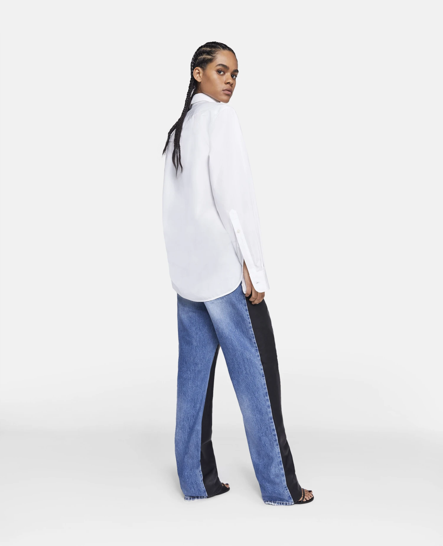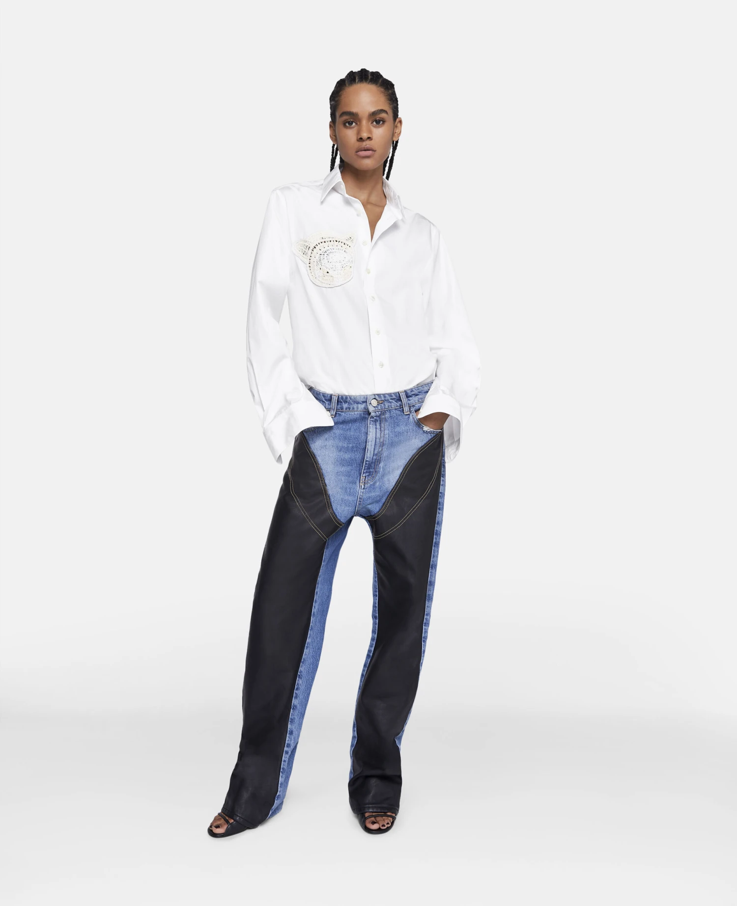 Legendary Japanese artist Yoshitomo Nara’s ‘Upset Kitty’ artwork elevates this longline shirt. Part of the Yoshitomo Nara × Stella McCartney collaboration, the shirt has a crochet patch at the chest and all the markings of a classic white shirt.