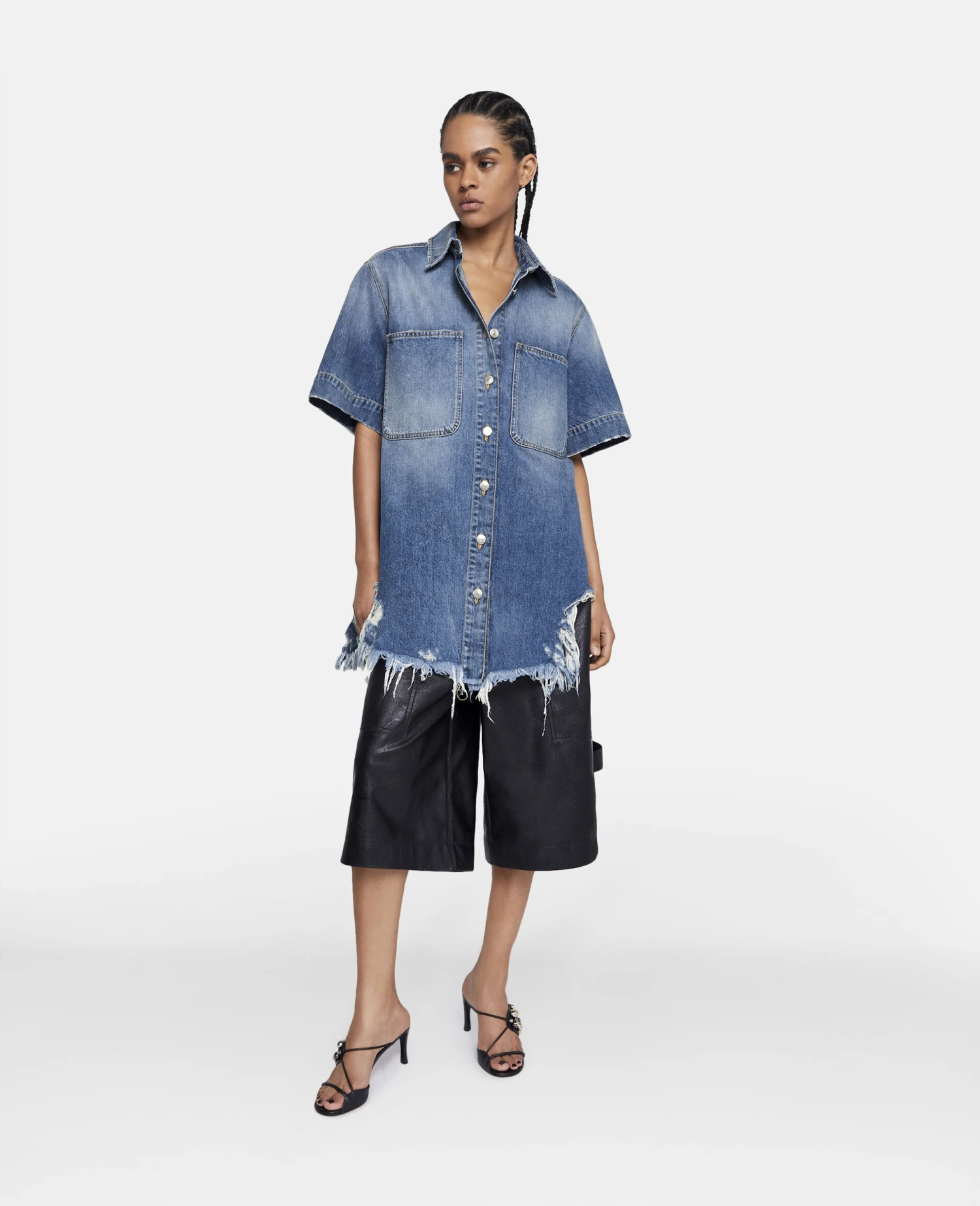 A vintage wash lends this denim shirt a defiant, authentic appeal. Made from organic cotton, the denim shirt is brought into the now with a fearless, deconstructed ripped hem.
